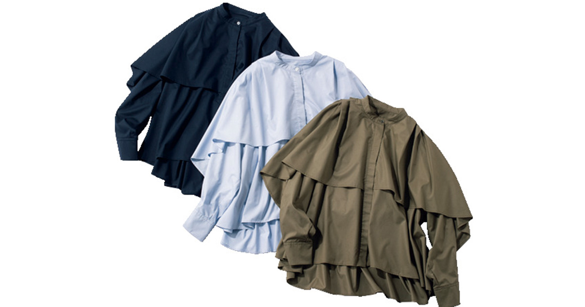 肩に入ったタックの効果で流れるように揺れるラッフルは、動くたびに表情を変え、シンプルなパンツ合わせでも華やぎます。ウエストインしなくても決まる前後差のある着丈や、ゆったりとしたシルエットで体形カバー力も抜群。比翼ボタンのきちんと感は学校行事やお仕事でも頼れる一枚。