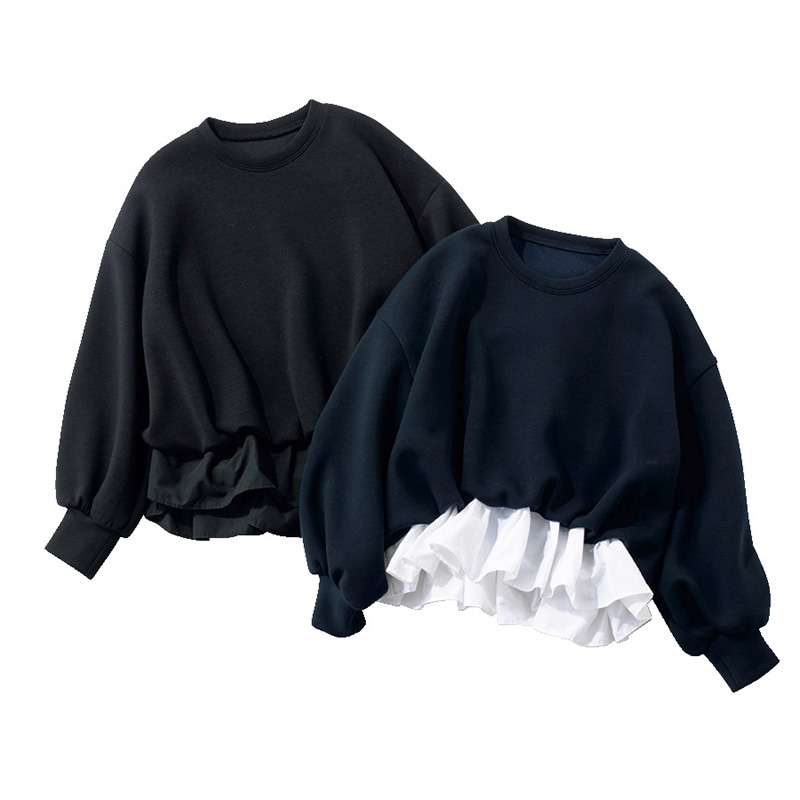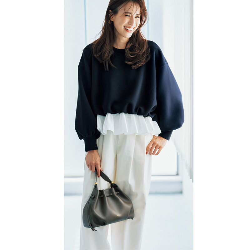 ベースはふんわりシルエットのネイビースウェット、その裾に白のタフタ素材をドッキング。まるでレイヤードしたような軽やかな華やぎを与えてくれます。流行の短丈スウェットのスタイルアップ効果はありつつ、腰まわりをさりげなくカバーできる絶妙な丈感でいいとこ取り。裏はスムースで肌あたりも柔らかく、インナー次第で春まで長く着られるのも魅力。一枚でコーデが完成する大人の名品トップスです。