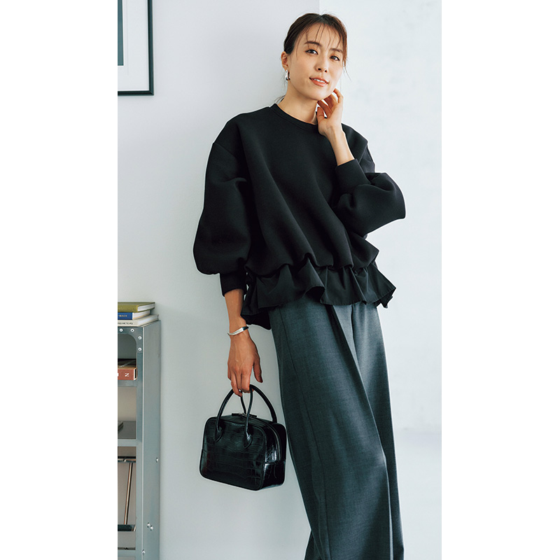 ブラックスウェットの裾に、同色のタフタ素材をドッキング。色味を抑えることで、華やぎあるフリルも大人仕様に。異素材を組み合わせることで黒一色でものっぺりせず、立体的でモードな雰囲気に仕上がります。
