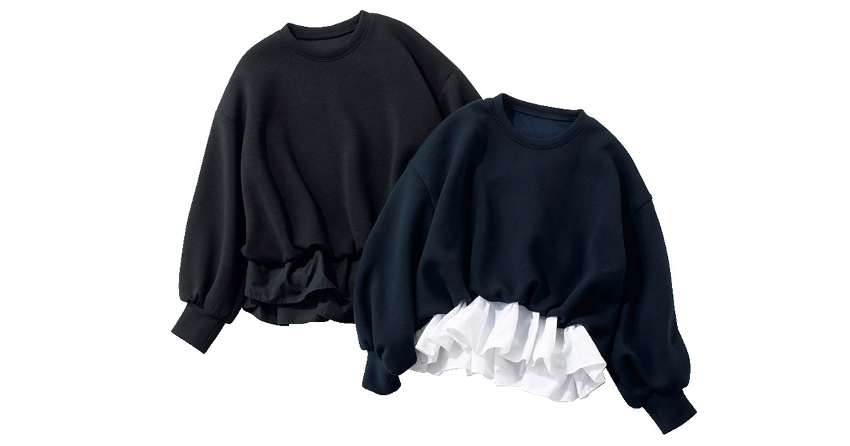 2022年に即完売し、復刻リクエストが相次いだ名品スウェット。スウェットにタフタ裾をドッキングし、重ね着風の軽やかさを演出。腰まわりも安心の丈感。