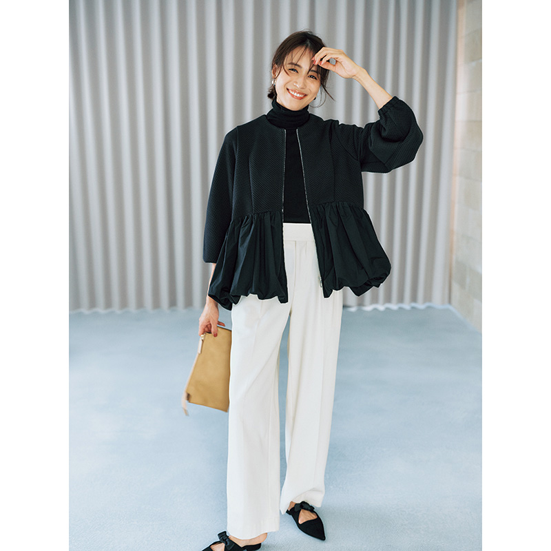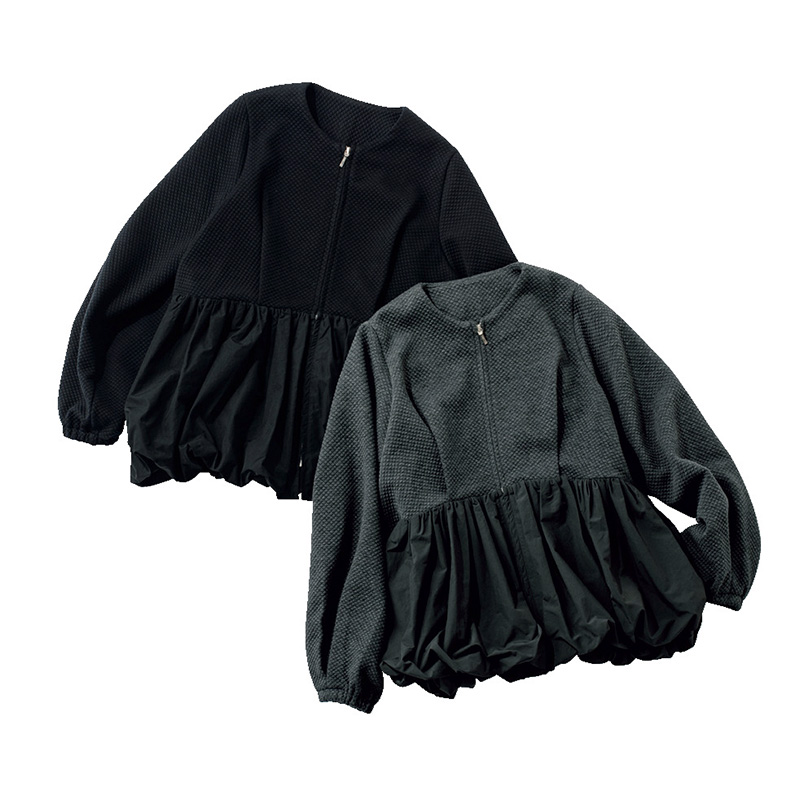 細かなキルティング風素材とタフタをドッキングした、ペプラムデザイン。フロントジップのシルバーがポイントに。丸みのあるバルーン裾が華やかで、本格的な冬まで長く使えます。