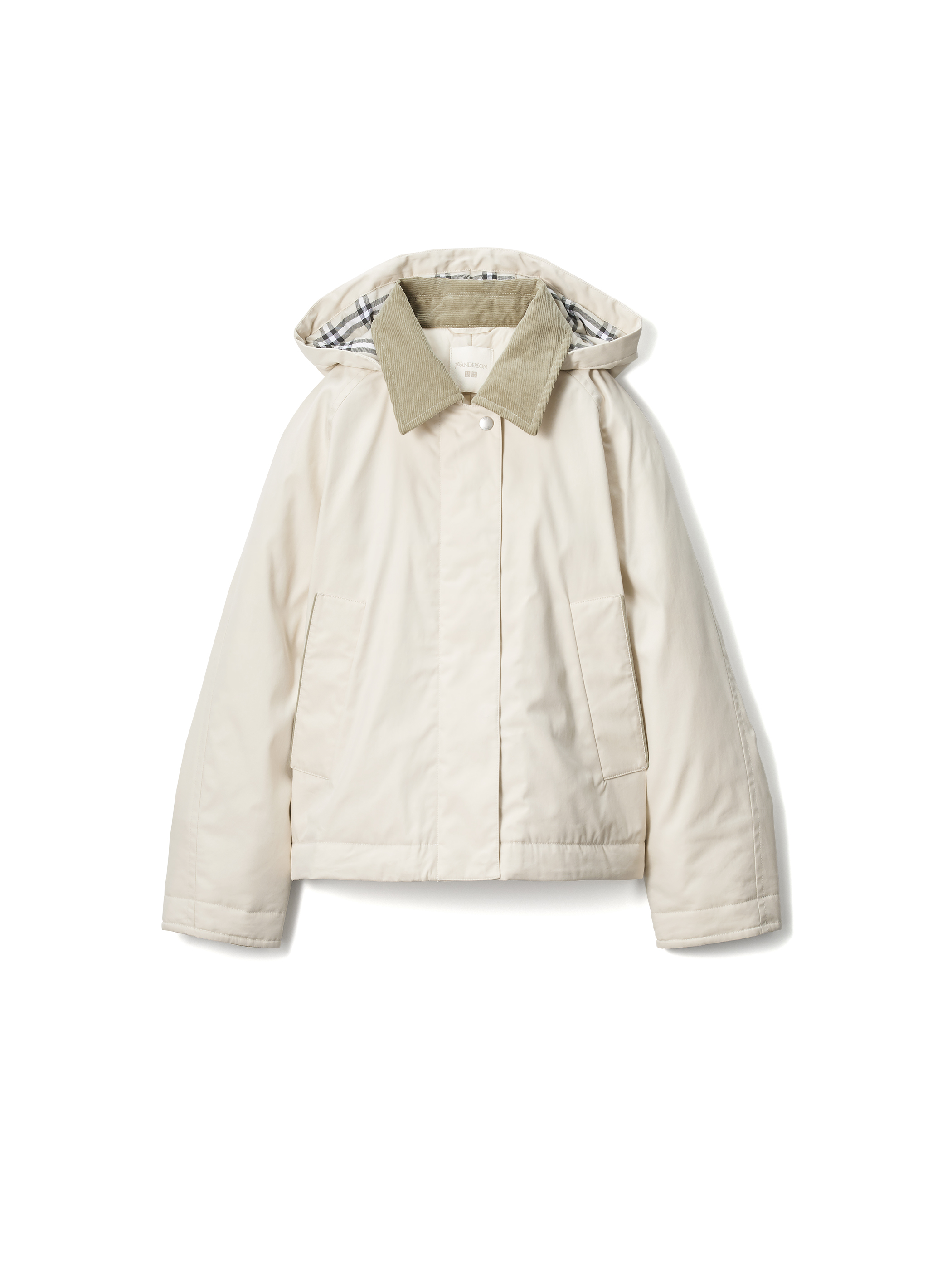 衿と袖裏のコーデュロイがアクセントになった高機動なショートジャケット。中綿には、ダウン並みの暖かさを実現するPUFFTECH(パフテック)素材を使用しており、試着した途端ぬくぬくと温かく! 寒い日の自転車も快適になりそうです。撥水加工が施されているから、突然の小雨も気にしなくてOK。裏地のチェックが可愛いフードは取り外し可能です。