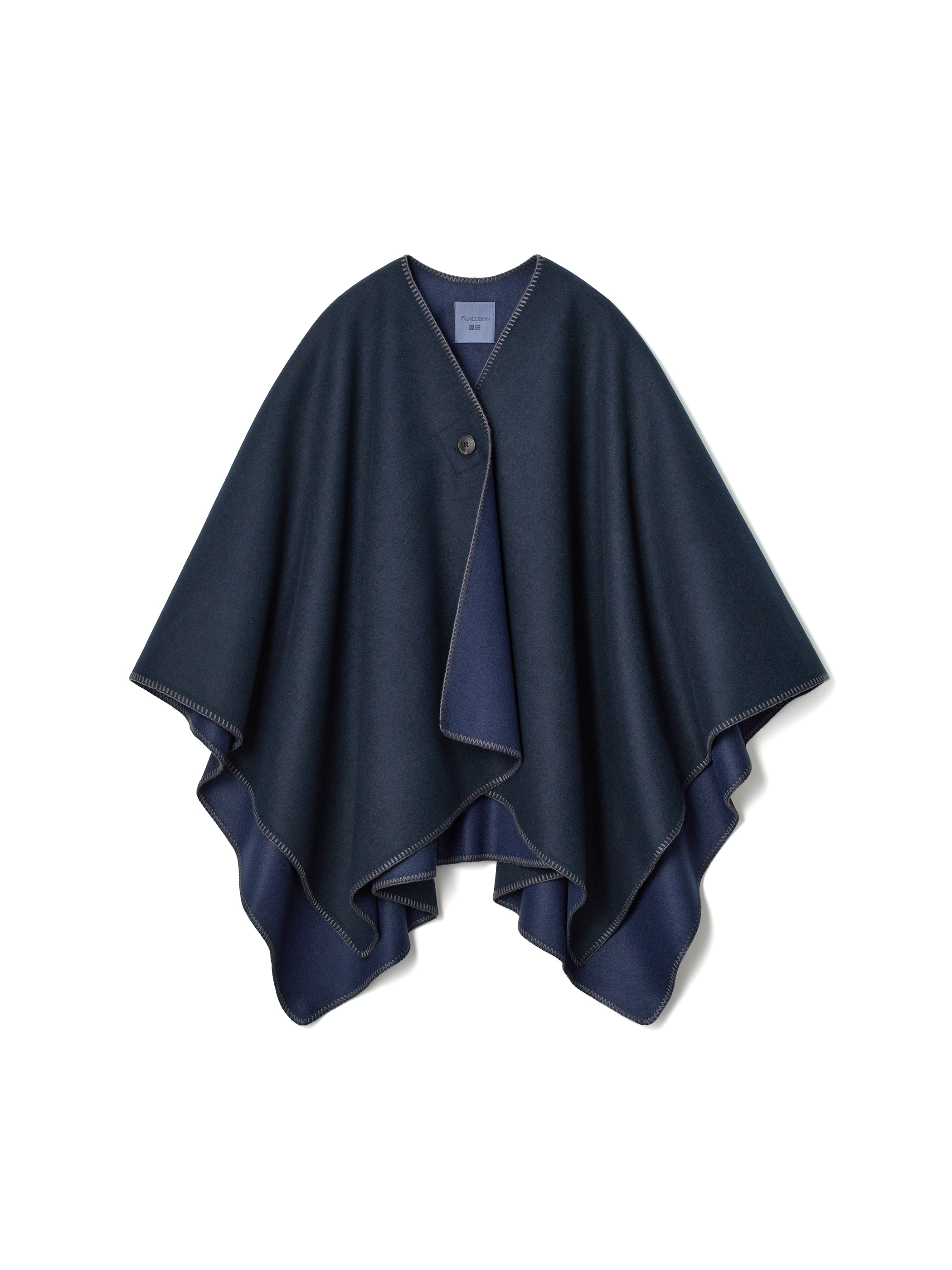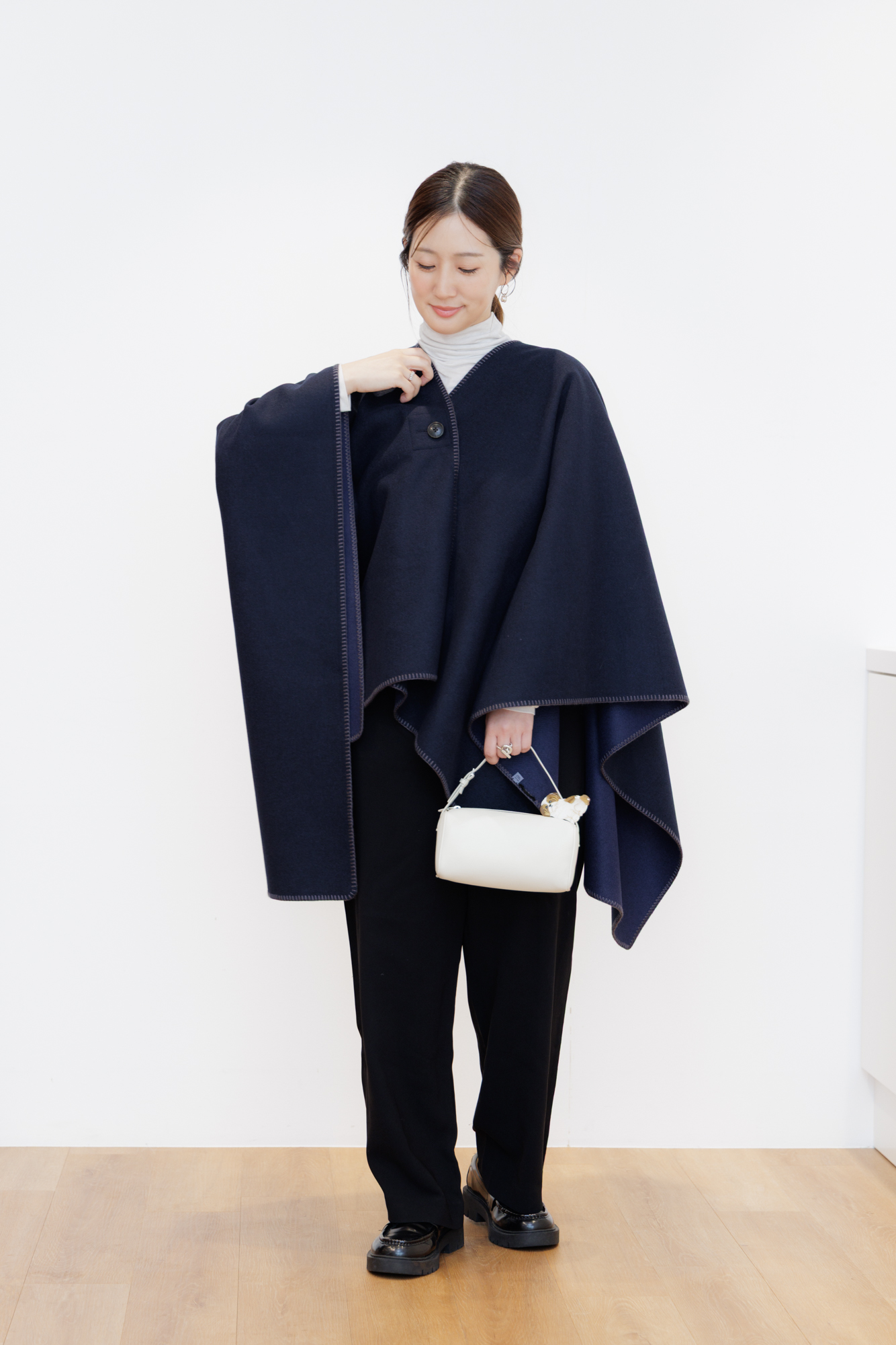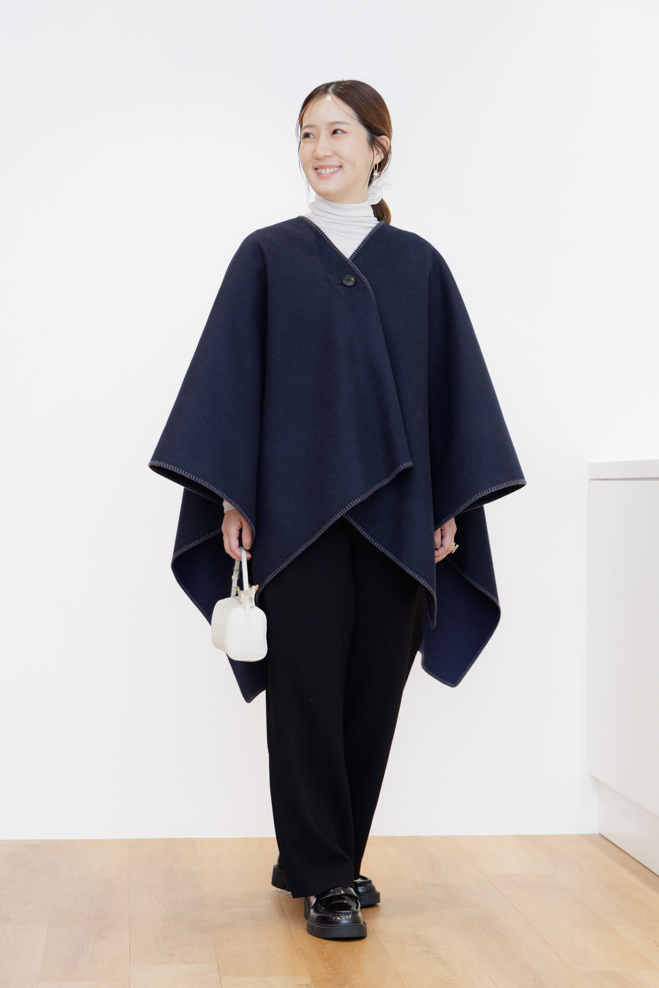 柔らかくて肌触り抜群のポンチョは、たっぷりと使用された生地がエレガント。重いかな…? と思いきや着てみるとびっくり、想像以上に軽いんです。ポンチョを畳むとブランケットとしても使えるから、送り迎えの際の車内での待ち時間にもぴったり。そのほかにも、公園やキャンプ、スポーツ観戦など秋冬の屋外シーンでも活躍しそうです。