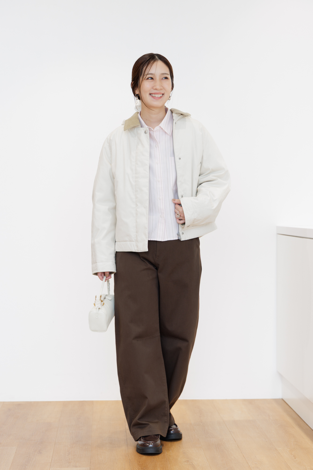 パフテックショートジャケット¥9,990 オックスフォードシャツ/ストライプ¥3,990 カーブパンツ¥4,990(すべてユニクロ アンド ジェイ ダブリュー アンダーソン/ユニクロ)コンフィールタッチローファー¥3,990(ユニクロ:シー/ユニクロ)・その他本人私物
