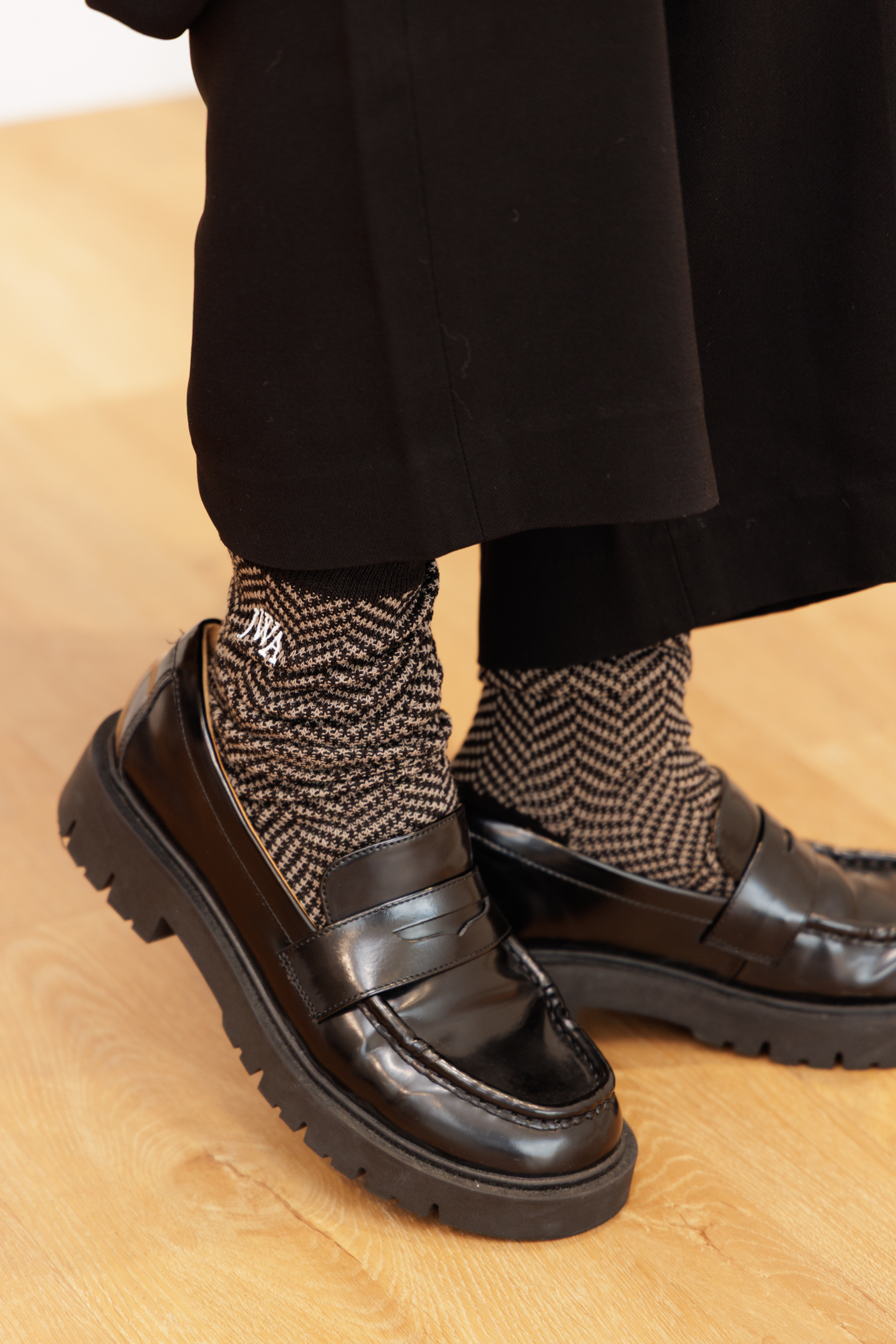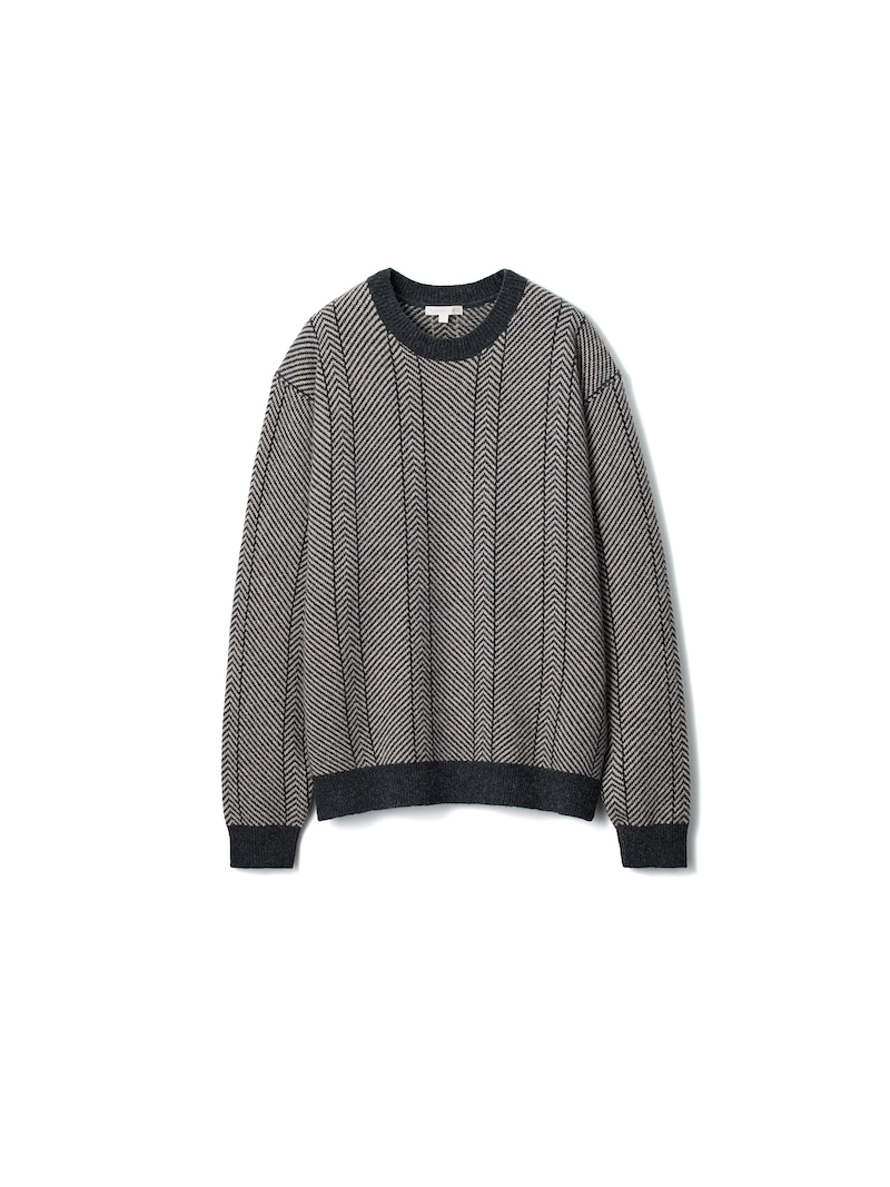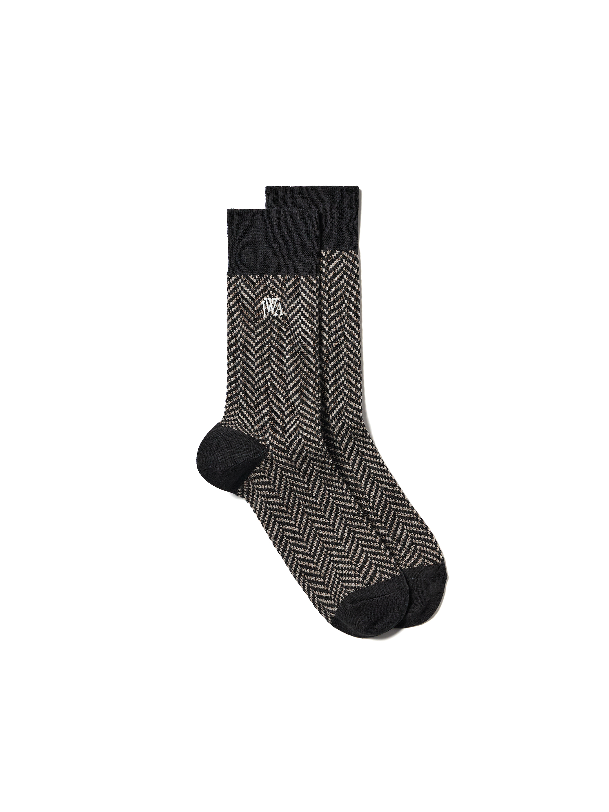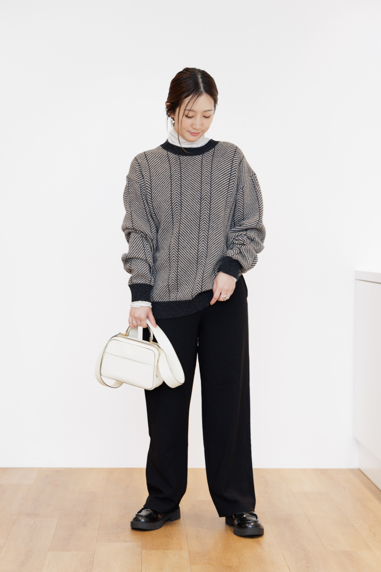 シックなヘリンボーン柄と縦に入ったラインのおかげで、オーバーサイズでも間伸びせずスッキリ着られるニット。メンズアイテムゆえの大きめシルエットなので、タートルネックやシャツをインしてリラクシーかつ上品な休日コーデに。同柄の靴下はヒートテック素材かつ、抗菌防臭機能付き。くしゅっとルーズに履いて、スカートやパンツの裾からチラ見せさせても◎。