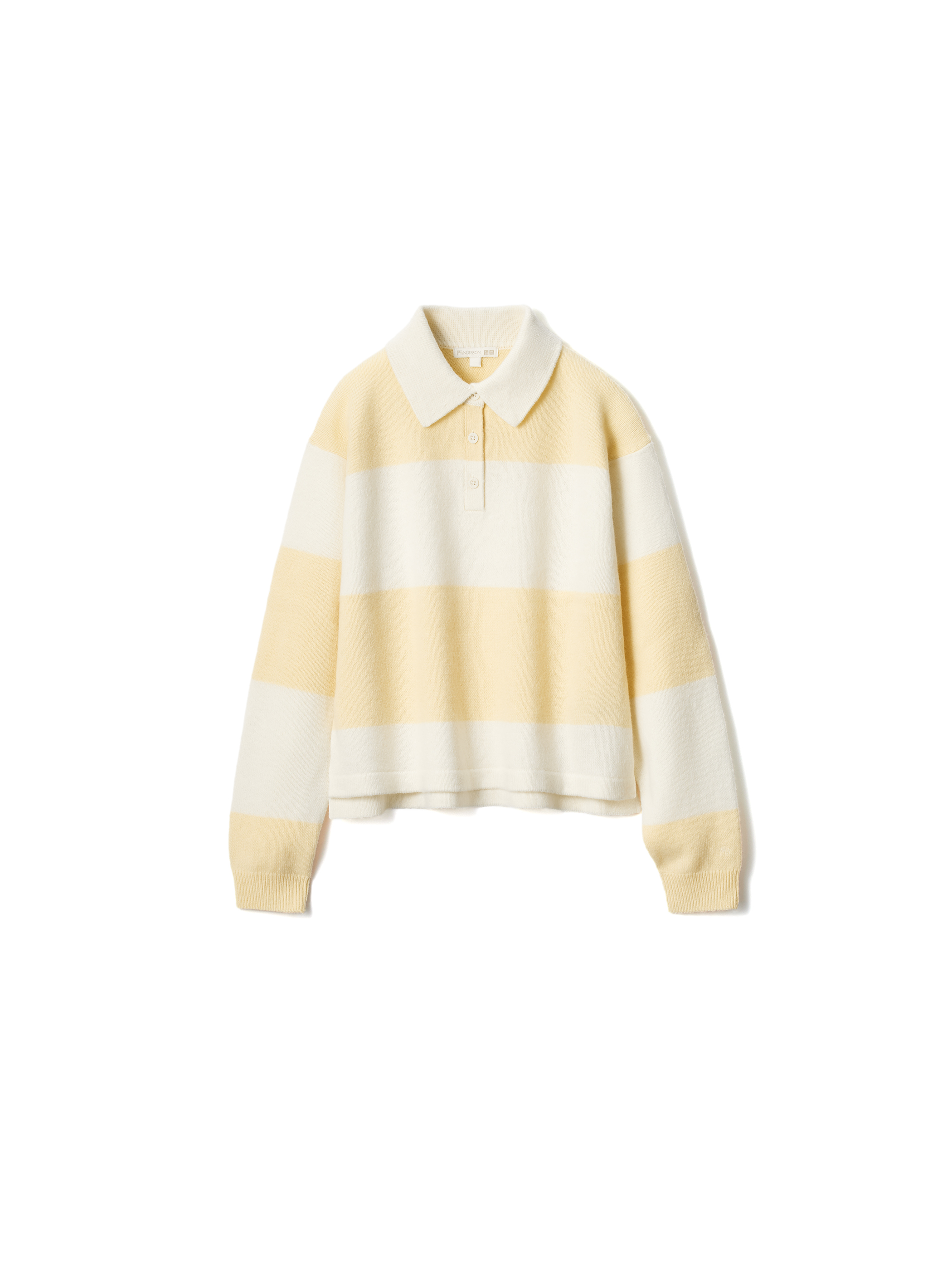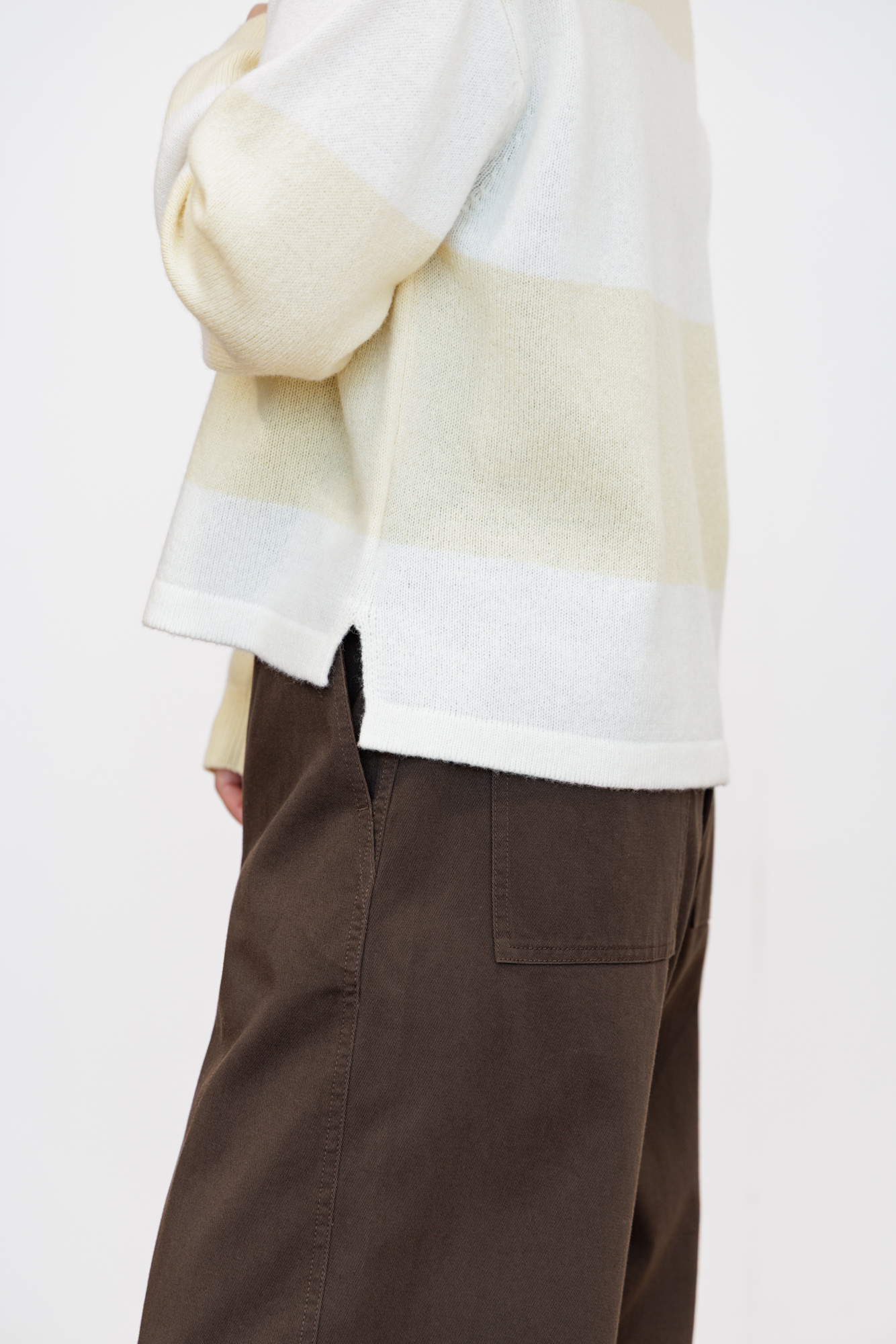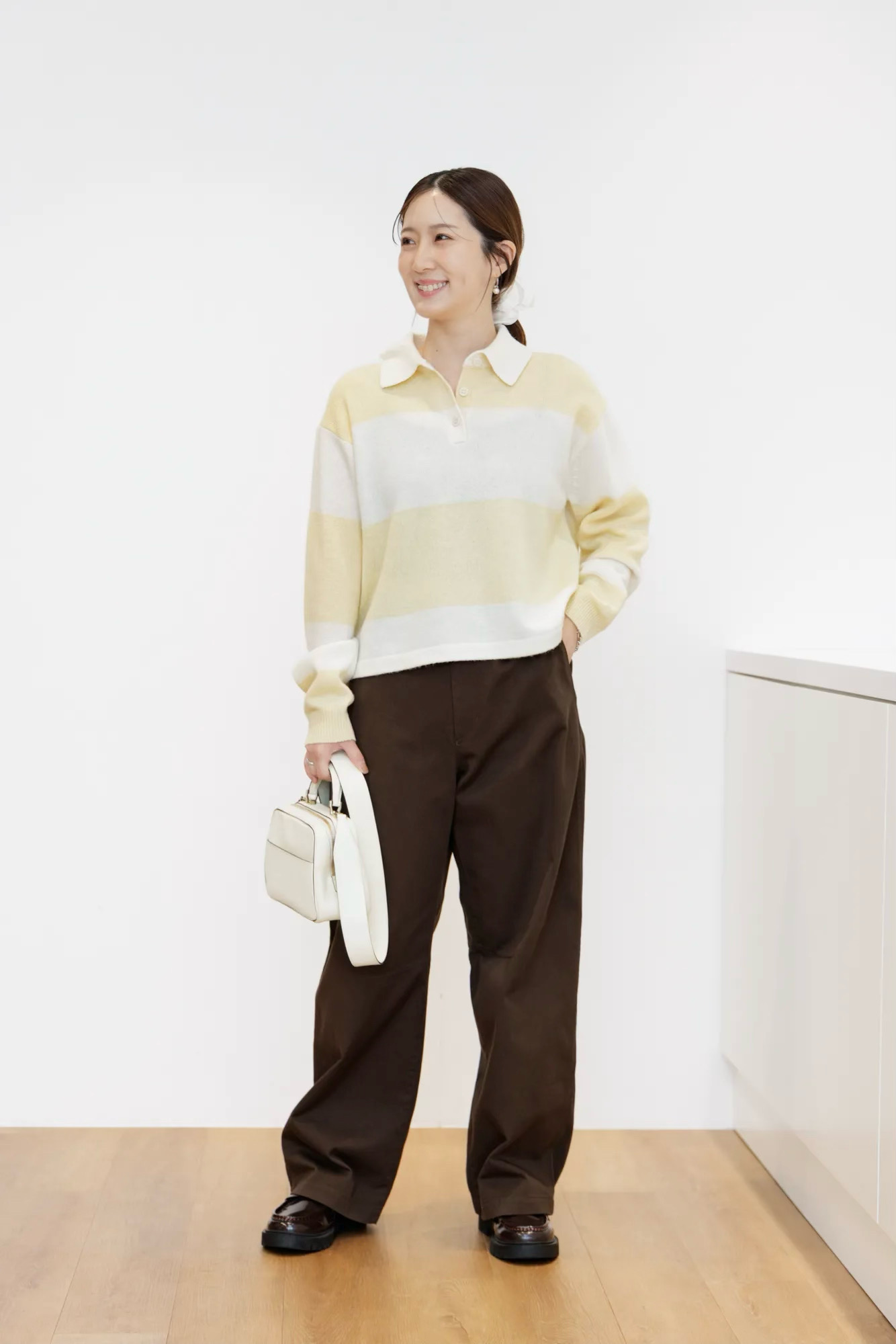 トレンドのバターイエロー×ホワイトの太めのボーダー柄は、着るだけで明るくハッピーな雰囲気に。秋冬になると穿きたくなるブラウンのパンツとも相性抜群です。ショート丈&ボクシーシルエットなので、ボトムスを選ばず忙しい朝でもワンツーでオシャレにキマります。裾はスリット入り&前後差のあるデザインで、サイドから見てもスッキリを確約!
