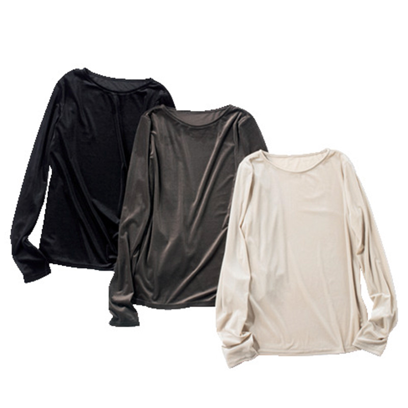 スムースなベロアの艶が華やぎを添えるカットソー。すっきりしたボートネックと長め袖で大人っぽく、ストレッチが利いて快適。手洗い可能。