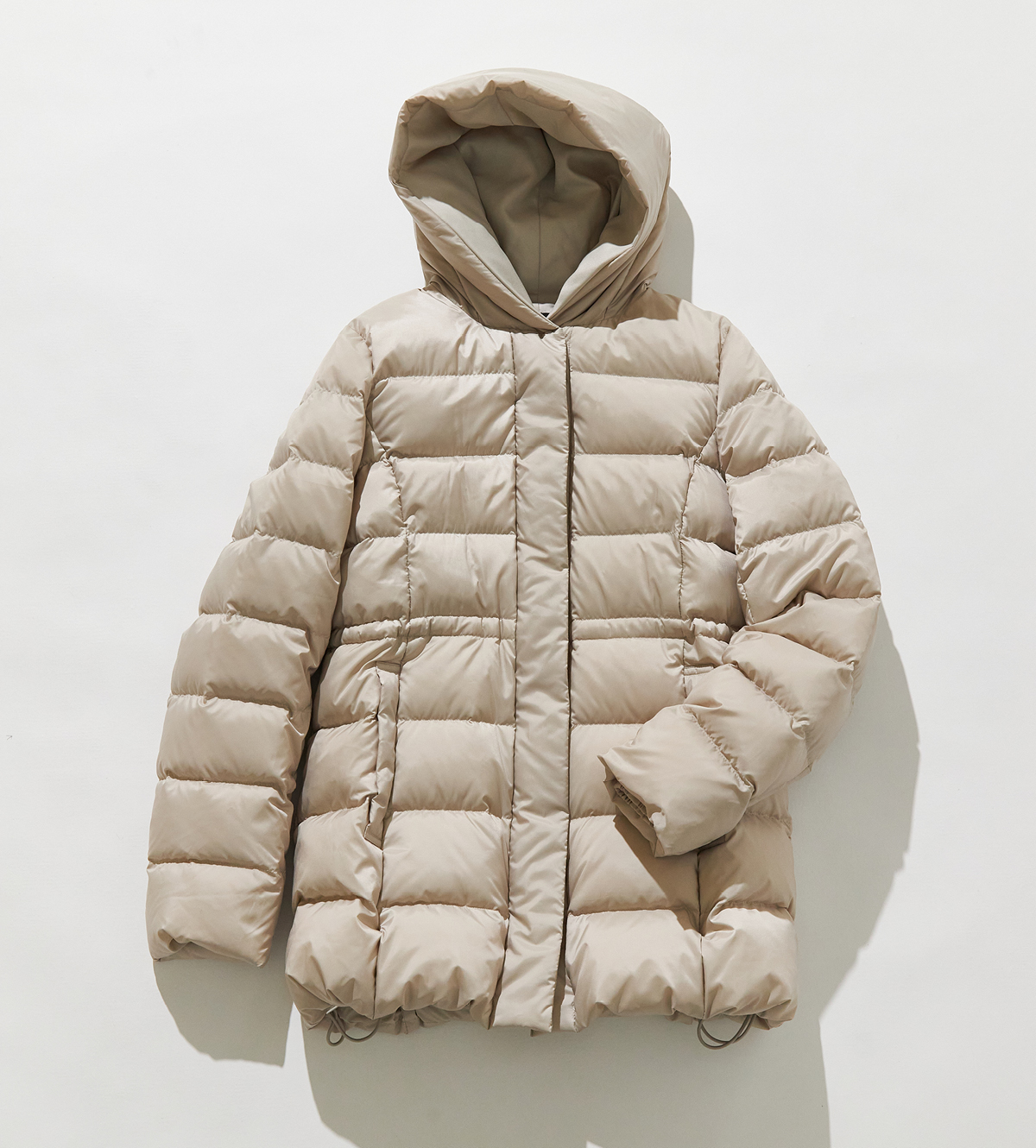 一日中外出の日でも暖かく包んでくれる、ヒップがしっかり隠れる長め丈に安心感! どんなテイストでも羽織れるスタイリッシュな細身ダウンは、カジュアルからきれいめまで振り幅のあるイベントが多い冬こそ頼れる。ウエストに入ったドローコードでシルエットチェンジも可能。