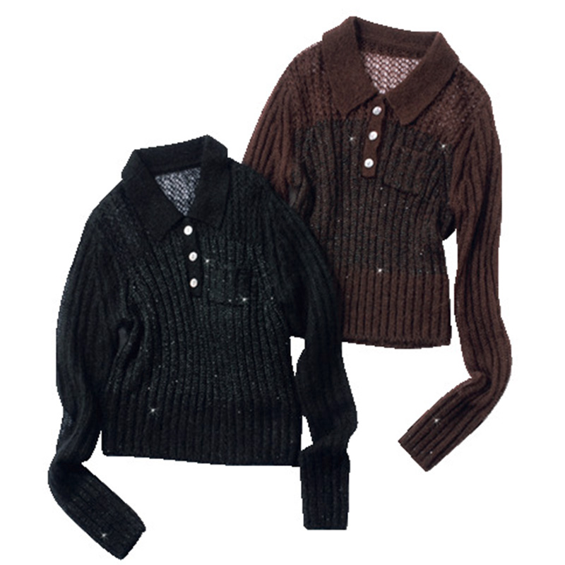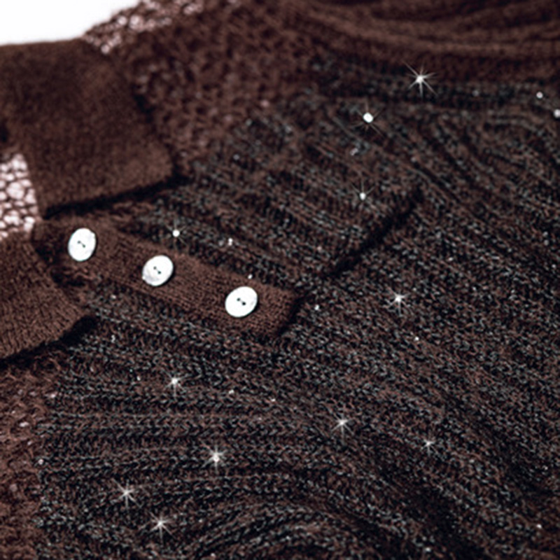 胸上は透け感のある編み地、胸下はスパンコールを編み込んだリブ編みで切り替え。フロントには上品なツヤを放つ貝ボタンを使用。