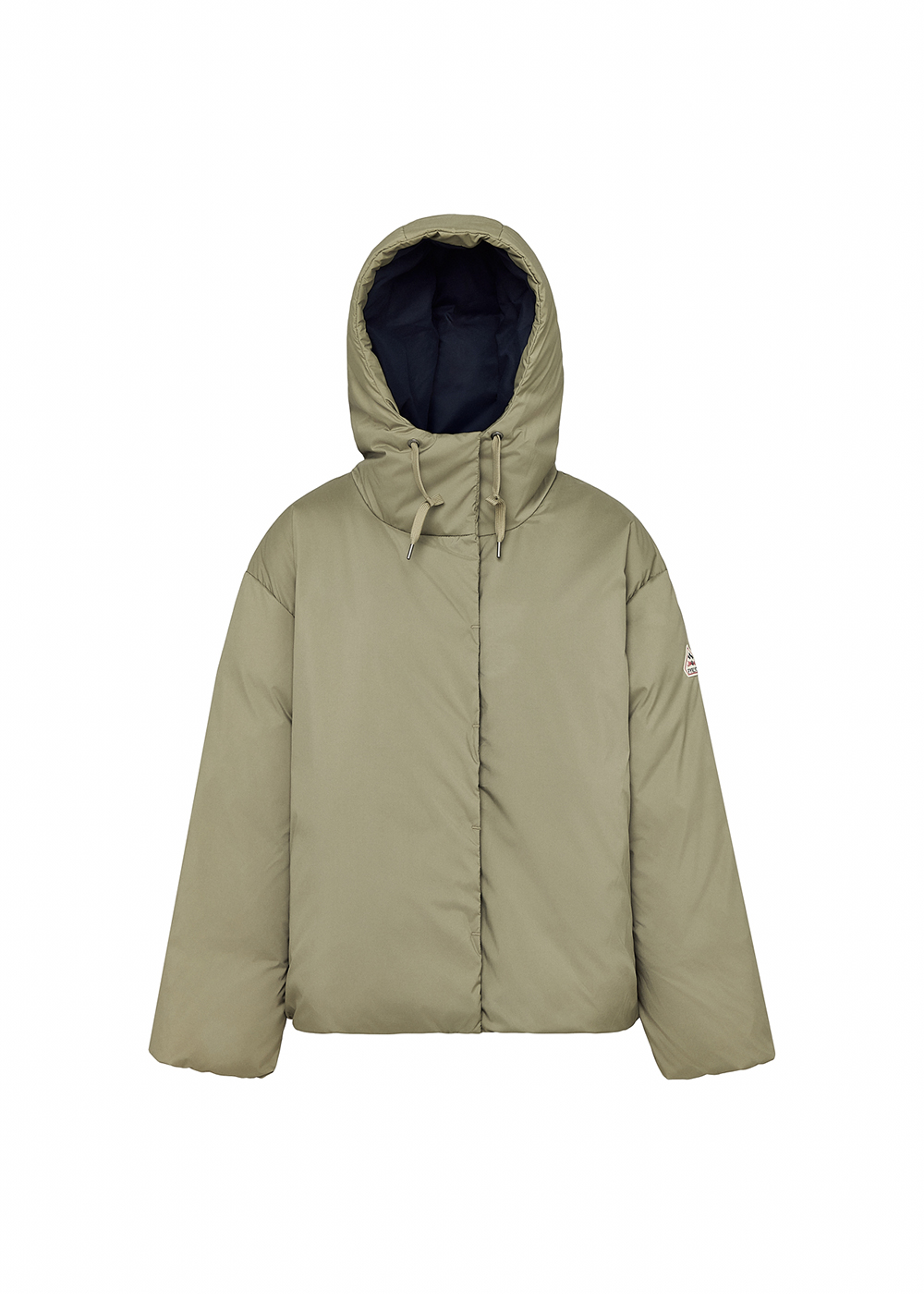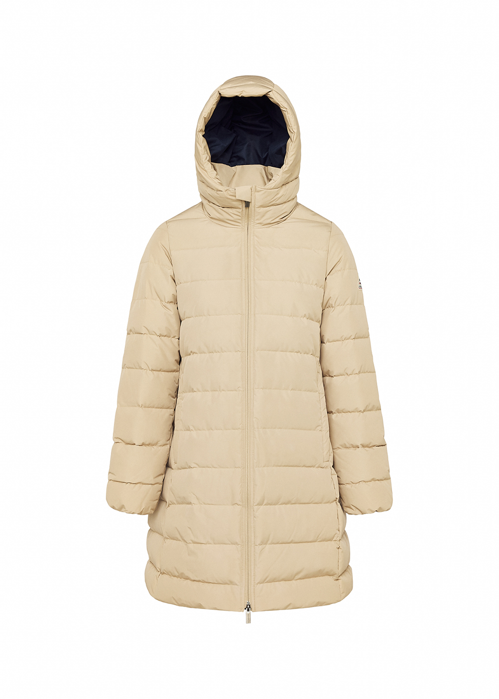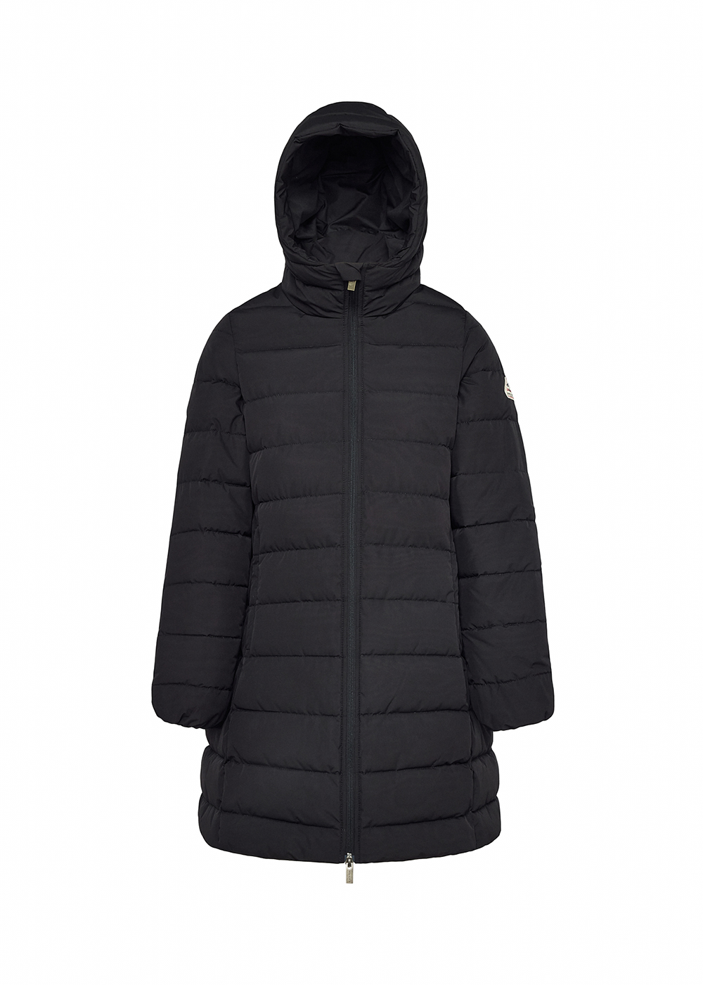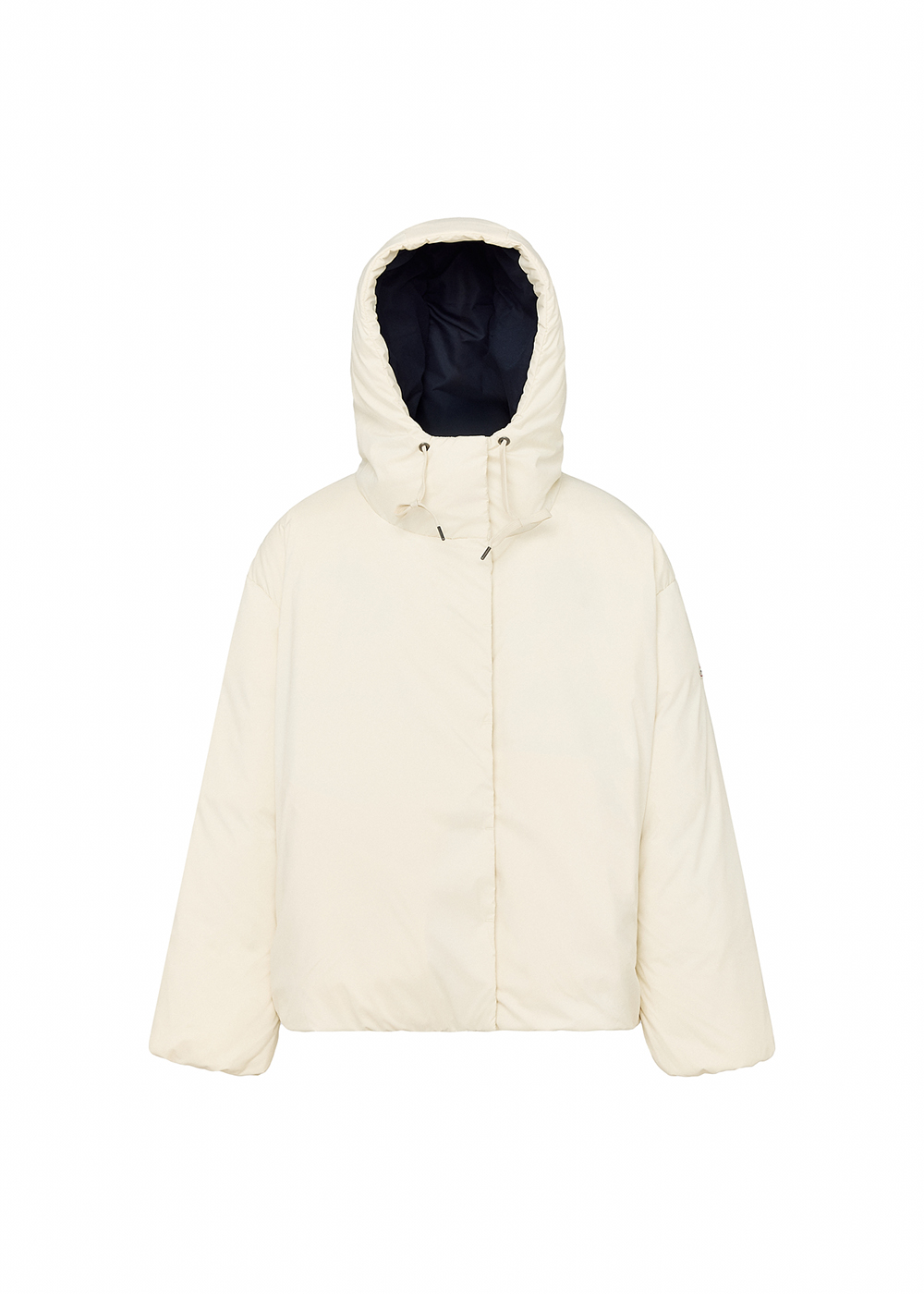 着脱できるフード付きのシンプルなデザインは、本国フランスでも人気が高いロングセラー。表地はピーチスキンのようにやわらかで上品。丈も絶妙で、ふんわりロングのスカートとも好相性。