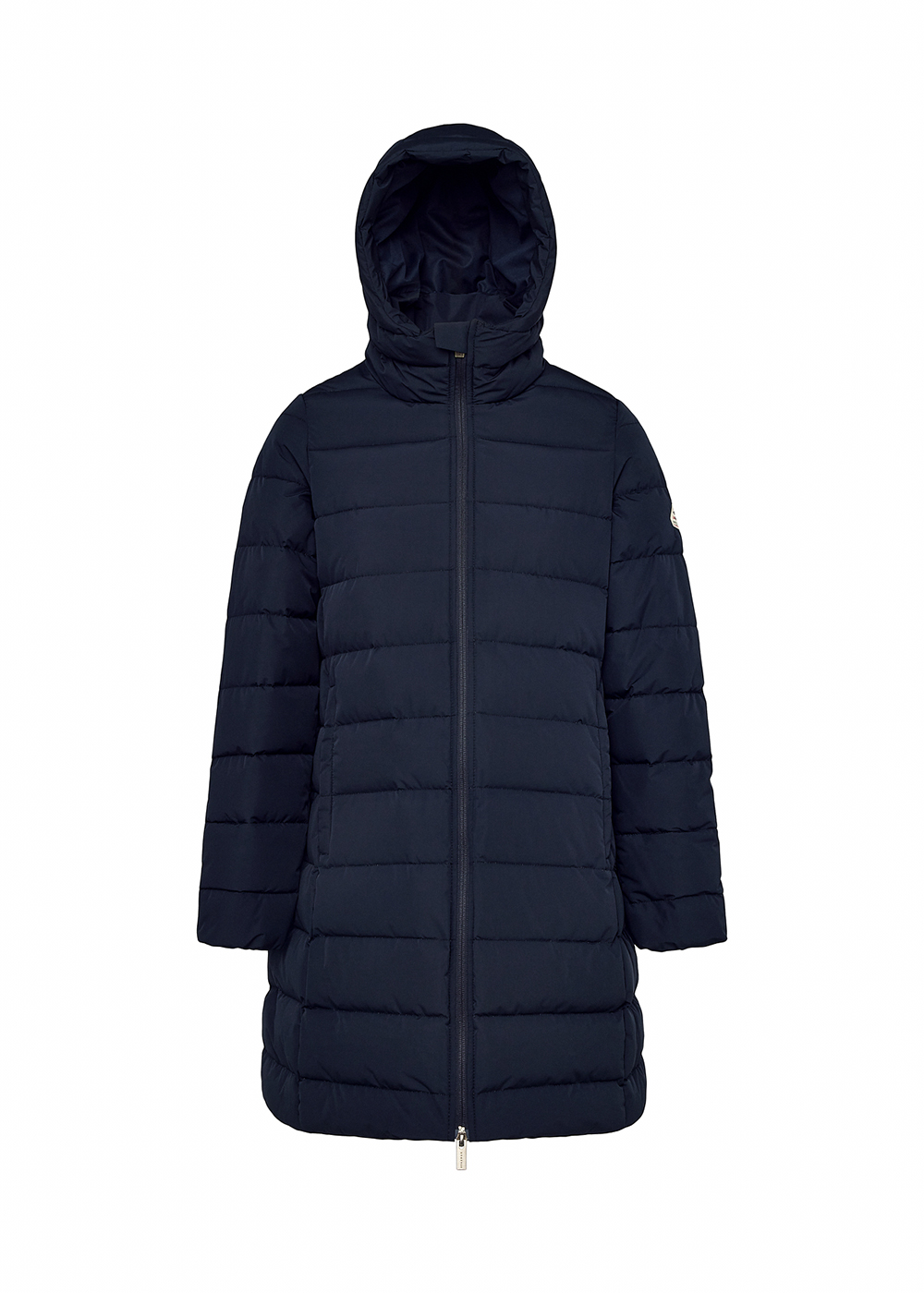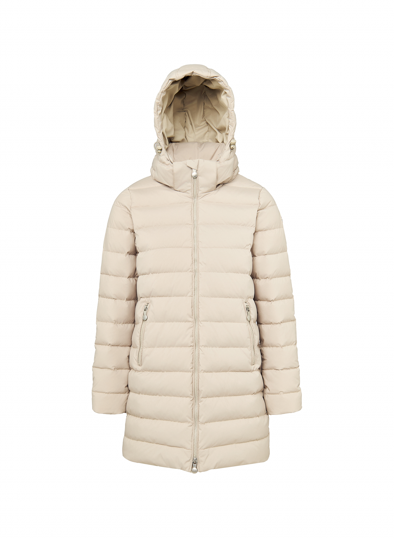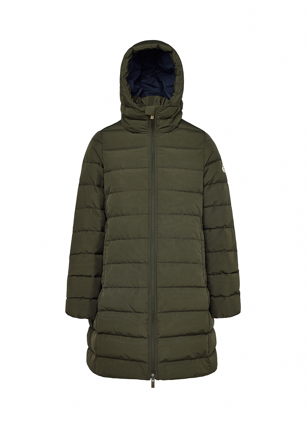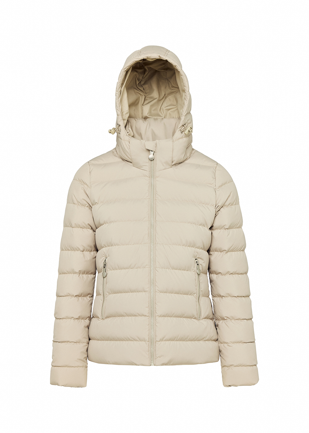 着脱できるフード付きのシンプルなデザインは、本国フランスでも人気が高いロングセラー。表地はピーチスキンのようにやわらかで上品。丈も絶妙で、ふんわりロングのスカートとも好相性。