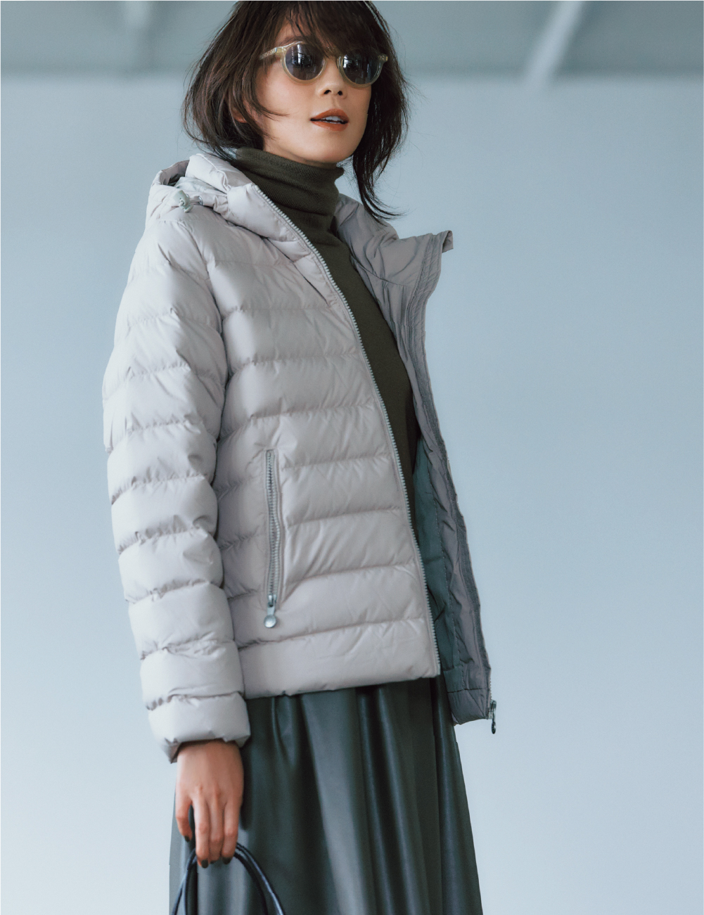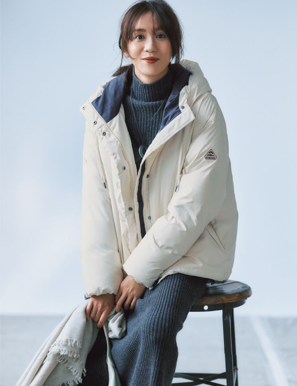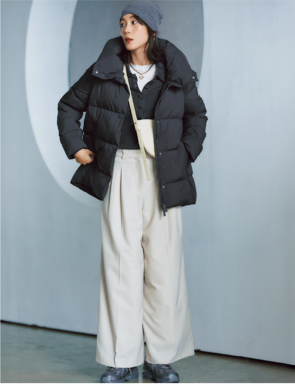 ダウン[ELAURA 2(エローラ 2)]¥93,500(ピレネックス/グリフィンインターナショナル)ニット¥71,500(オスロー/フィルム)中に着たTシャツ¥9,000(TW)バッグ¥29,700(バケット バゲージ/アイネックス)スニーカー¥15,400(ニューバランス/ニューバランスジャパンお客様相談室)パンツ¥39,600〈エストネーション〉ピアス¥60,500〈ヴィール〉(ともにエストネーション)ネックレス¥8,800(エイチアッシュ/フォーティーン ショールーム)その他/スタイリスト私物