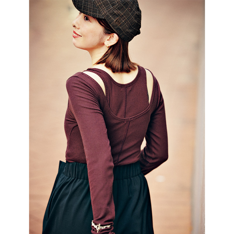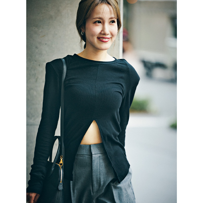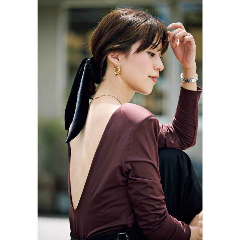 「去年からフィット感あるロンTを集めていますが、今年はプラス、背中に大胆なカットがあるものに注目しています。手作りしたリボンのヘアアクセを付けて、バックスタイルを強調!」