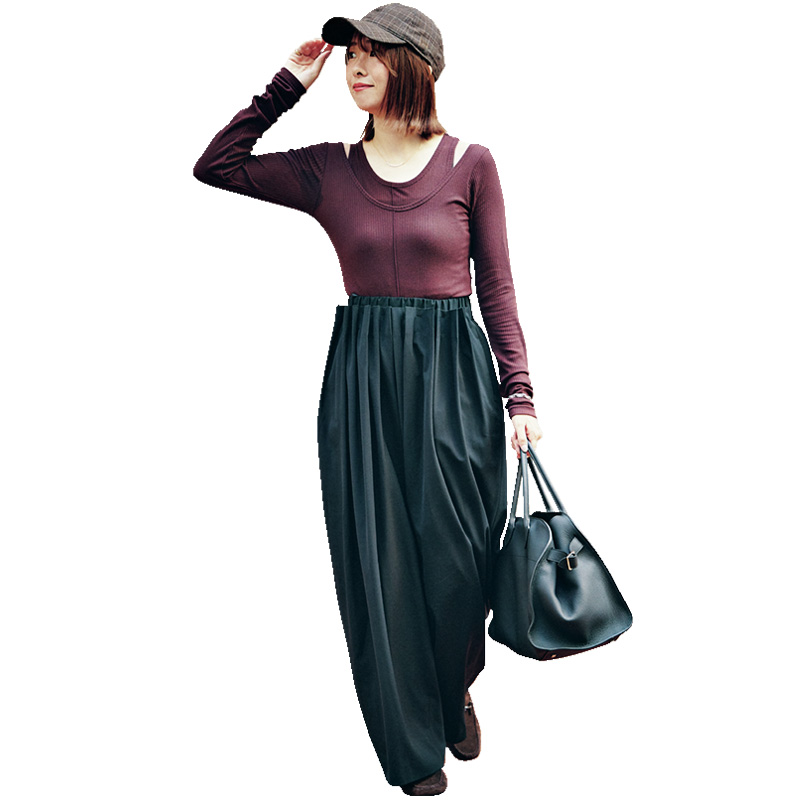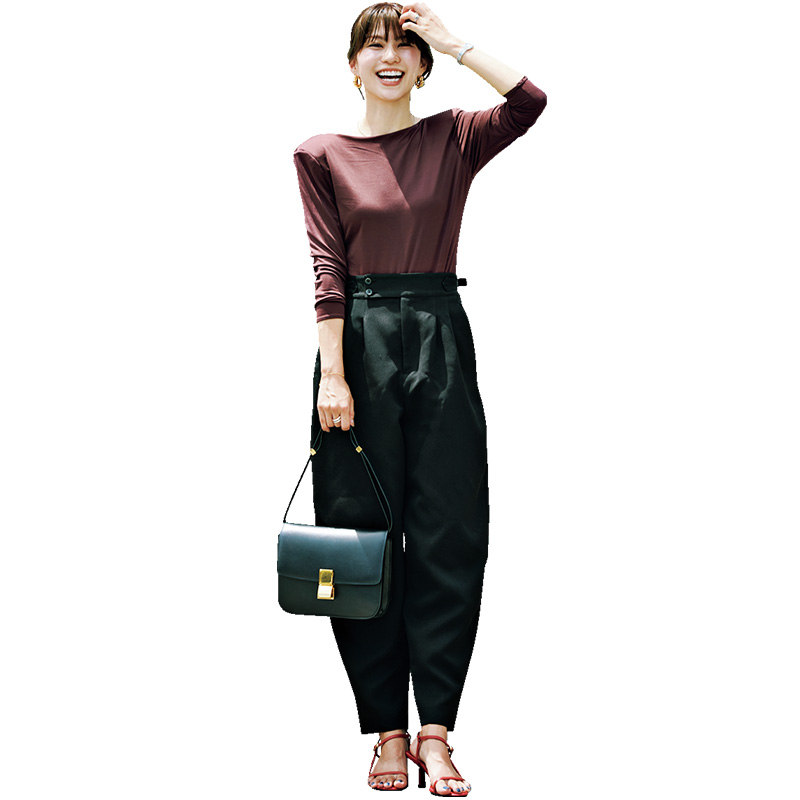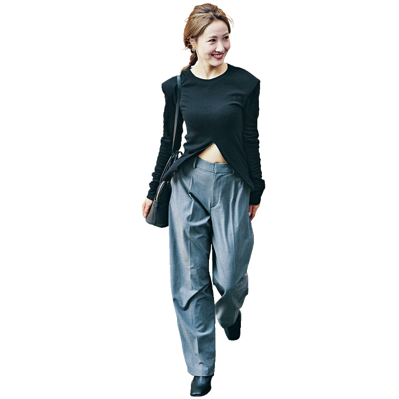 「普段カチッとしているビジネスライクなコーディネートの日が多いからこそ、休日は肌見せトップスで気分を変えたい。いつも着ているベーシックパンツもメリハリが出ます」
