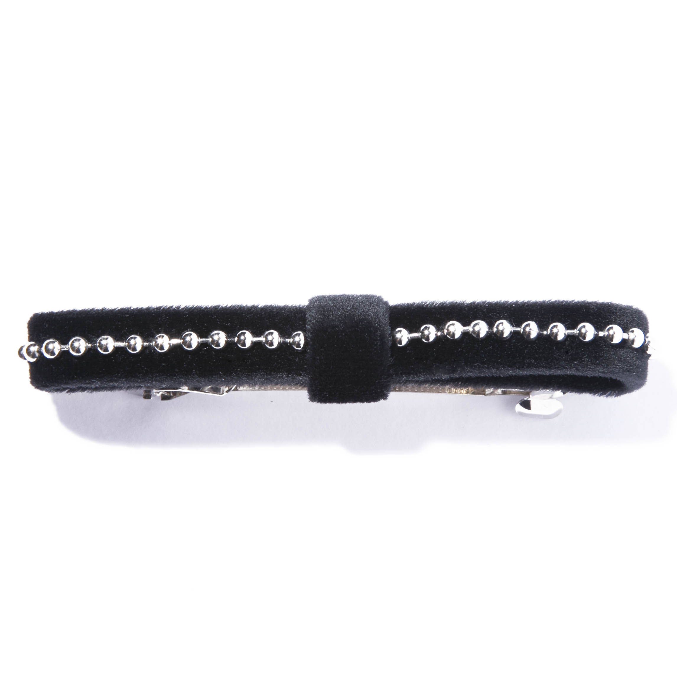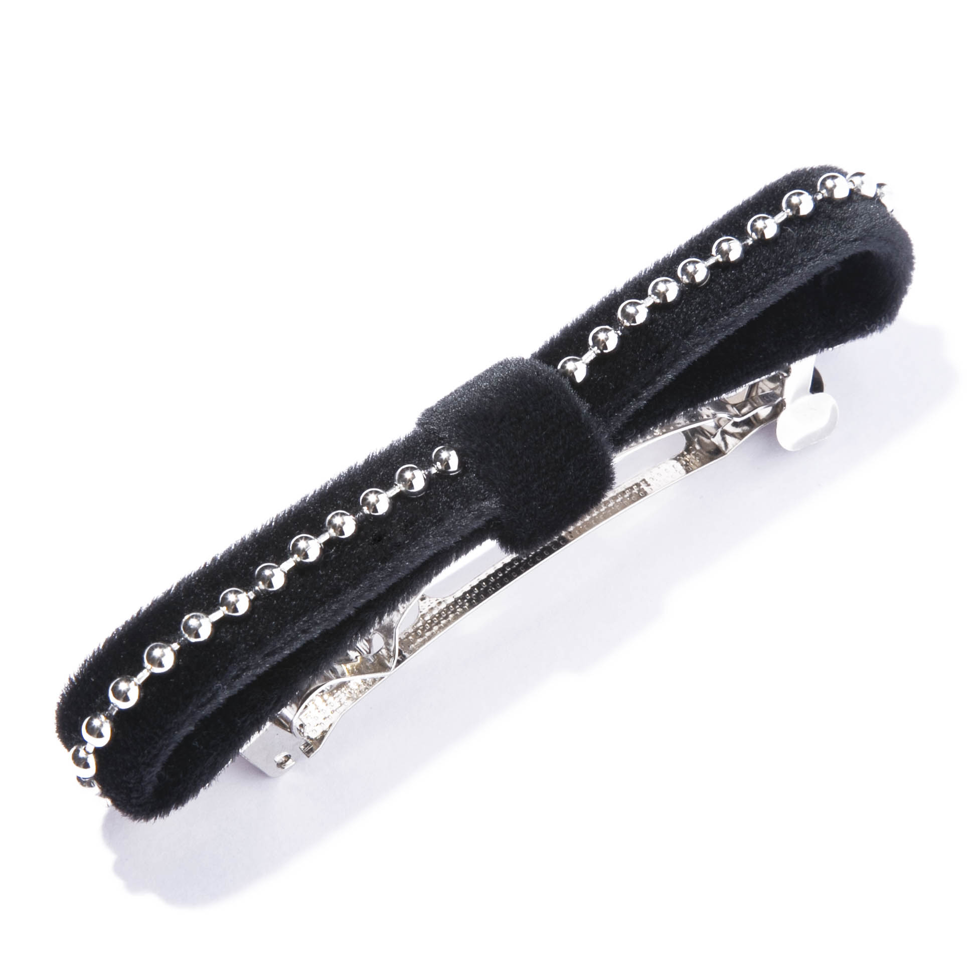 ベルベットを使用したシックなバレッタ。細いリボンの中央に、メタリックなチェーンのラインを効かせたデザインはほのかにエッジィで洒落感のある仕上がりに。幅広でしっかりと髪を留められるので、ハーフアップもしやすいです。