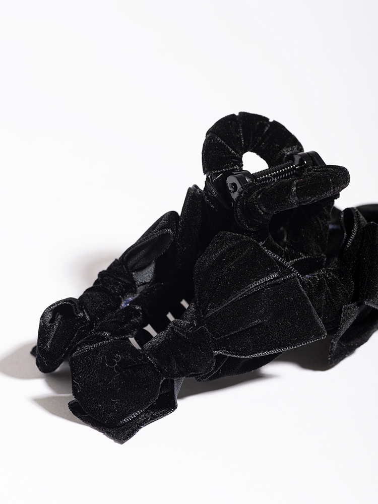 高級感のあるベロア素材がエレガントなクリップ。たっぷり並んだリボンのおかげで後ろ姿まで抜かりないスタイルに。存在感のある大きめサイズは、ロングヘアや毛量が多い髪もしっかりホールド。ざっくりまとめるだけでも作り込んだようなヘアアレンジに。