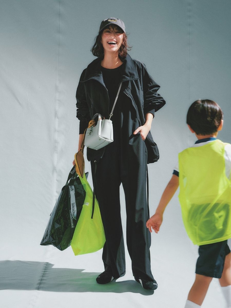 全身黒やネイビーのシンプルコーデにシャカアウターをプラスすれば、それだけで運動会気分が高まる! バッグや靴、キャップなど小物をどれか1つを白にするとクリーンさがプラスされます。ジャケットはサードマガジン、オールインワンはニアー ニッポン、スニーカーはプーマ、キャップはフレッシュサービス、バッグはトッズのもの。