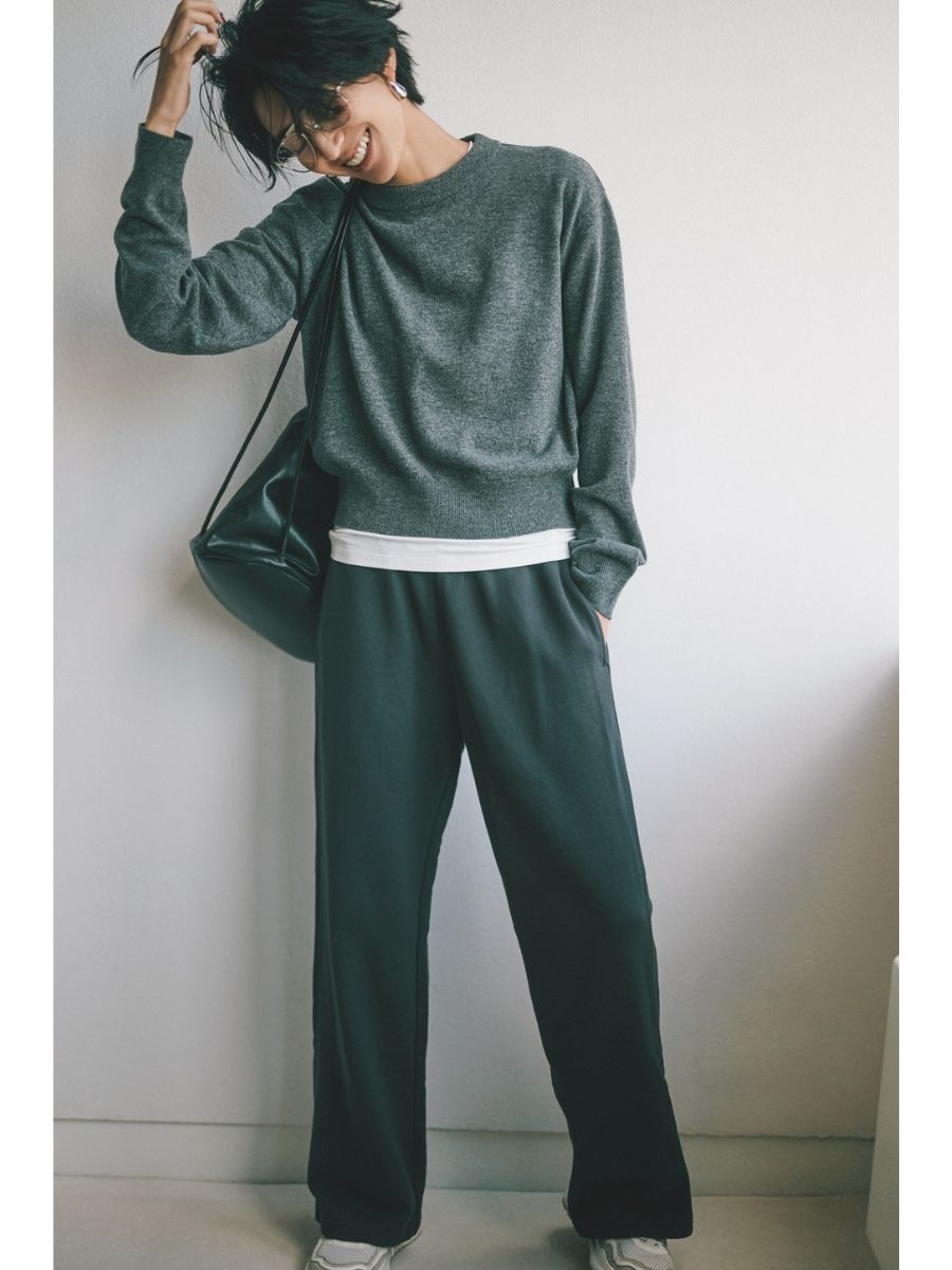 ベーシックなニットトップスもスウェットパンツを合わせれば運動会スタイルに。動きやすいスウェットは、立ったり座ったりが多いレジャーシートでの観戦や、競技に参加するママにぴったりです。インナーに白Tを着て、ワントーンコーデにメリハリを出して。ニットとスウェットパンツはともにWRAY、バッグはカシュカシュ、スニーカーはアスファルトのもの。