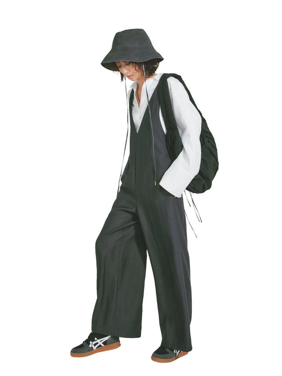楽に着られてサマになるサロペットは季節問わず人気のアイテム。かがんだ時に背中が見えないのも、立ったりしゃがんだりが多い運動会では助かるポイント。長袖シャツをインしてキレイめに仕上げれば、スニーカーや帽子、リュックと合わせても上品さが保てます。寒ければシャツの下に薄手のタートルを着るのも◎。オールインワンはサロン アダム エ ロペ、シャツはアルアバイル、スニーカーはアシックス、ハットはエントワフェイン、バッグはエミのもの。