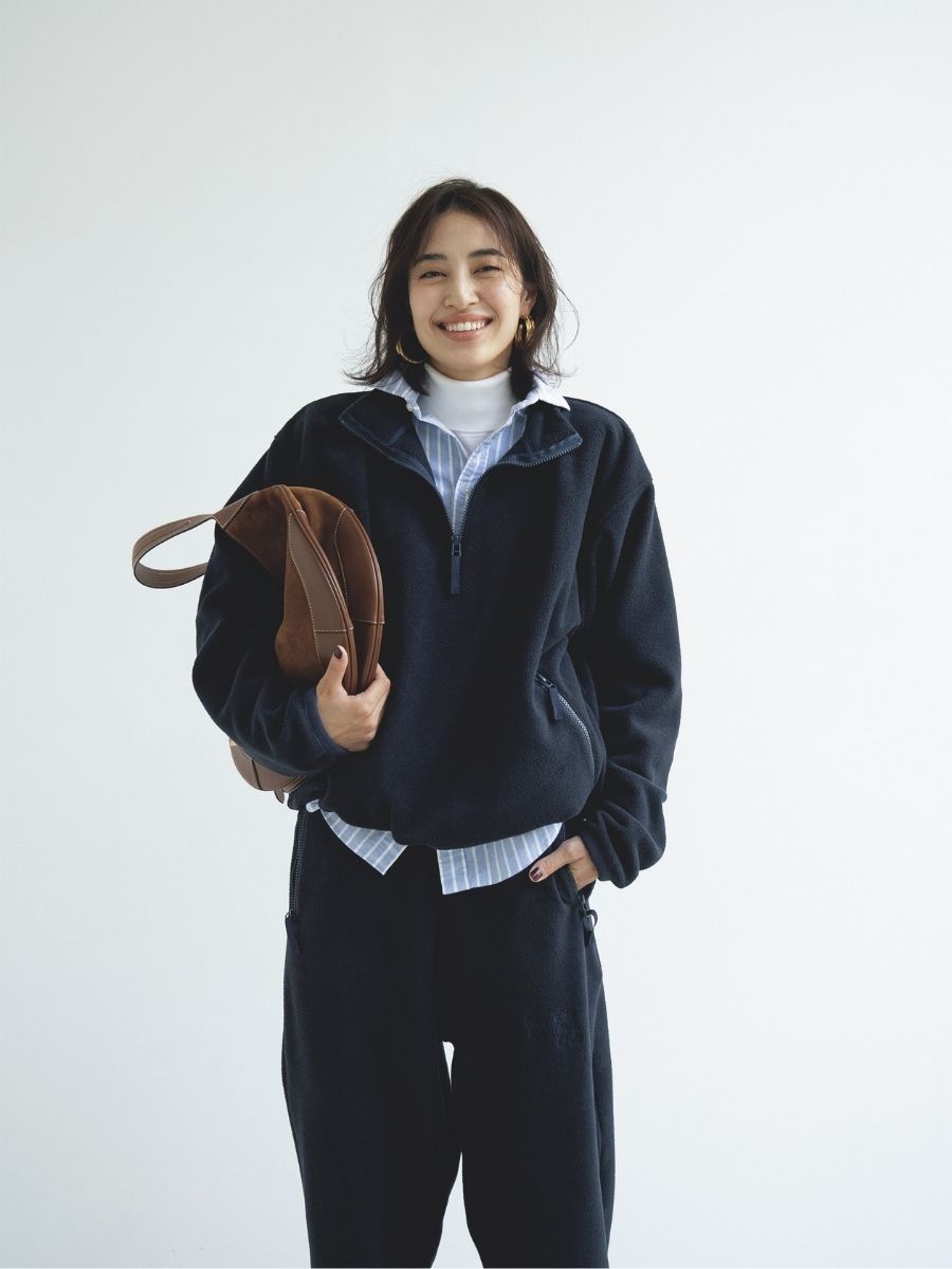 昨年からトレンドのハーフジップスウェットは首元を開けて、中に水色系のシャツを挟むと清潔感が出て学校行事にぴったり。寒さが気になる場合は、タートルをインしてもOK。スウェットとタートルニットはロエフ、シャツとバッグはポロ ラルフ ローレン、パンツはシーのもの。