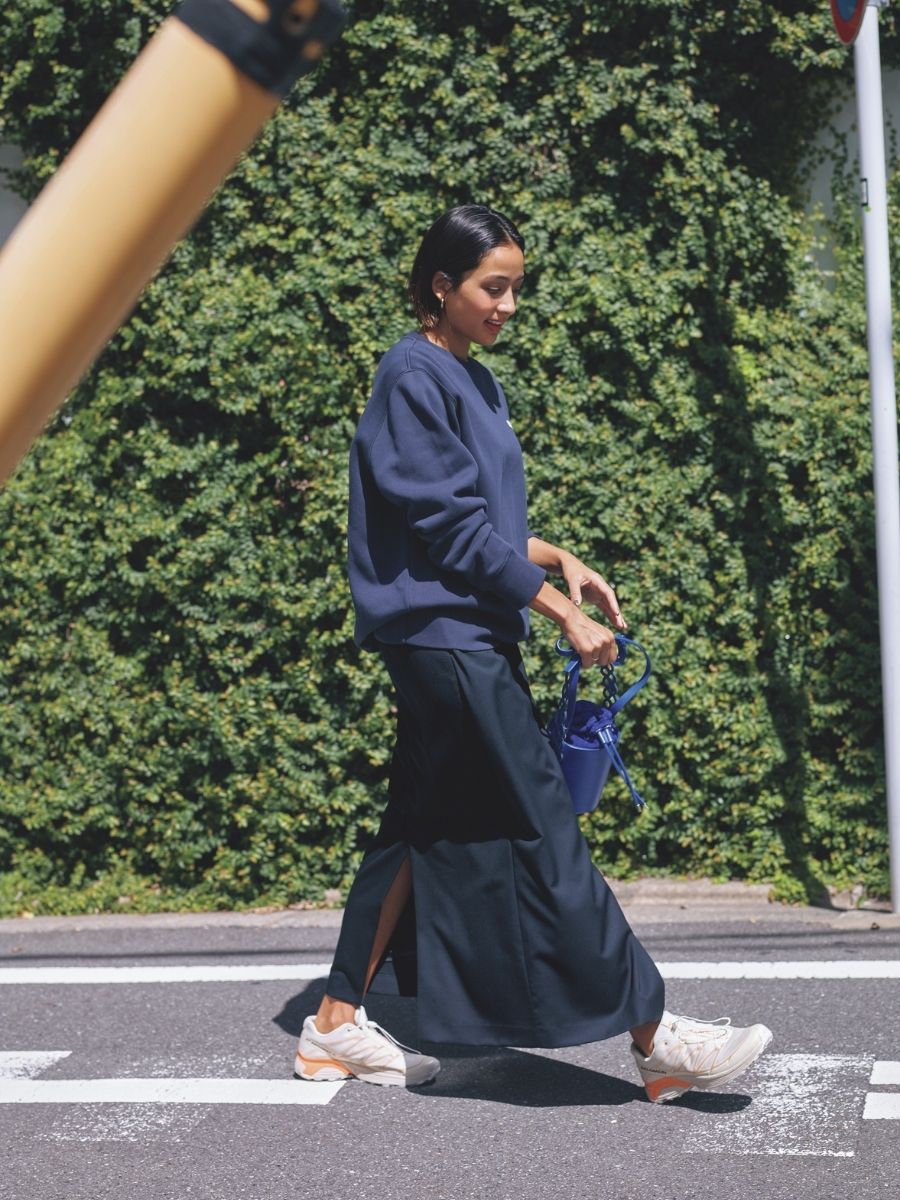 気温が下がってくる時期のアクティブシーンで頼りになるスウェット。とはいえカジュアルすぎないか不安…という人は、オールネイビーでまとめてみて。白系のスニーカーで足元を軽やかに仕上げれば、親しみやすいネイビーママに。スウェットはオートリー、スカートはプロタゴニスタ、スニーカーはサロモンのもの。