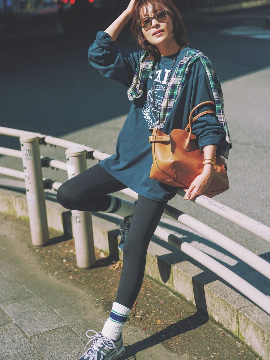 動きやすく旬っぽさも出るレギンスは、運動会にこそ試してほしいアイテム。ビッグTやゆるっとスウェットなどを合わせれば、ヒップ周りのラインをカバーしつつ洒落たシルエットに。トップスはチャンピオン、シャツはポロ ラルフローレン、レギンスとスニーカーはニューバランス、バッグはザンケッティ、靴下はトウキョウ ウィークリー ジャーナルのもの。