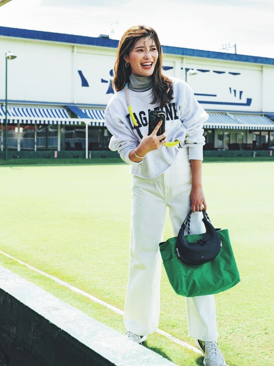 スポーティなロゴスウェットは、タートルニットを挟んできちんとした印象をプラス。上下を白でまとめれば、ロゴスウェットでもキレイ見え。そのうえ派手色になりがちな子どものクラスカラーアイテムもなじみやすい! スウェットはサードマガジン、タートルニットはスリードッツ、デニムパンツはニードバイヘリテージ、スニーカーはナイキ、黒のバッグはオソイ、緑のトートバッグはノマディスのもの。