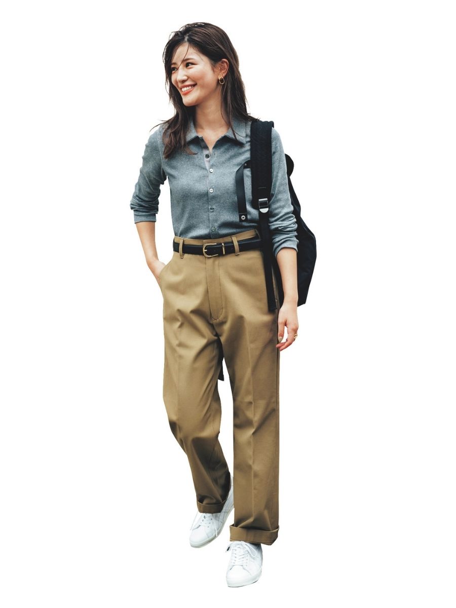 トレンドの衿付きニットは、最高気温20度前後の運動会トップスに持ってこい! タック入りのチノパンをベルトで引き締めて、きちんと感を残しながらカジュアルさをプラス。トップスはマカフィー、パンツはシンゾーン、スニーカーはオニツカタイガーのもの。