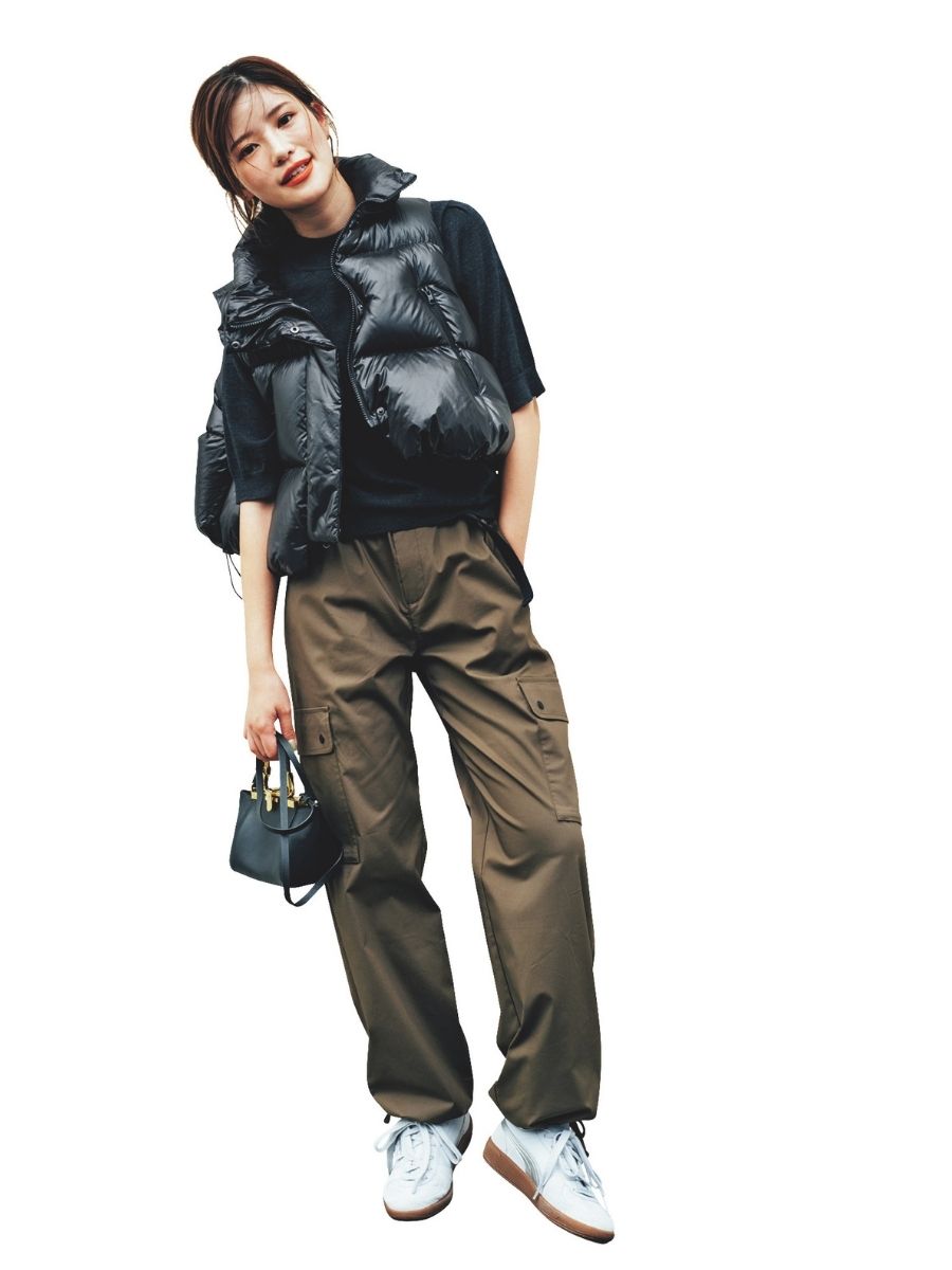 11月にこそ着たいダウンベストは腕周りの機動力ばっちり。厚手のスウェットやモコモコニットと合わせると重たく見えるので、11月の運動会にはロンTや薄手のニットと合わせるのがちょうどよさそうです。ダウンベストはル フィル、ニットはデ プレ、パンツはエーグル、スニーカーはエミ、バッグはザンケッティのもの。