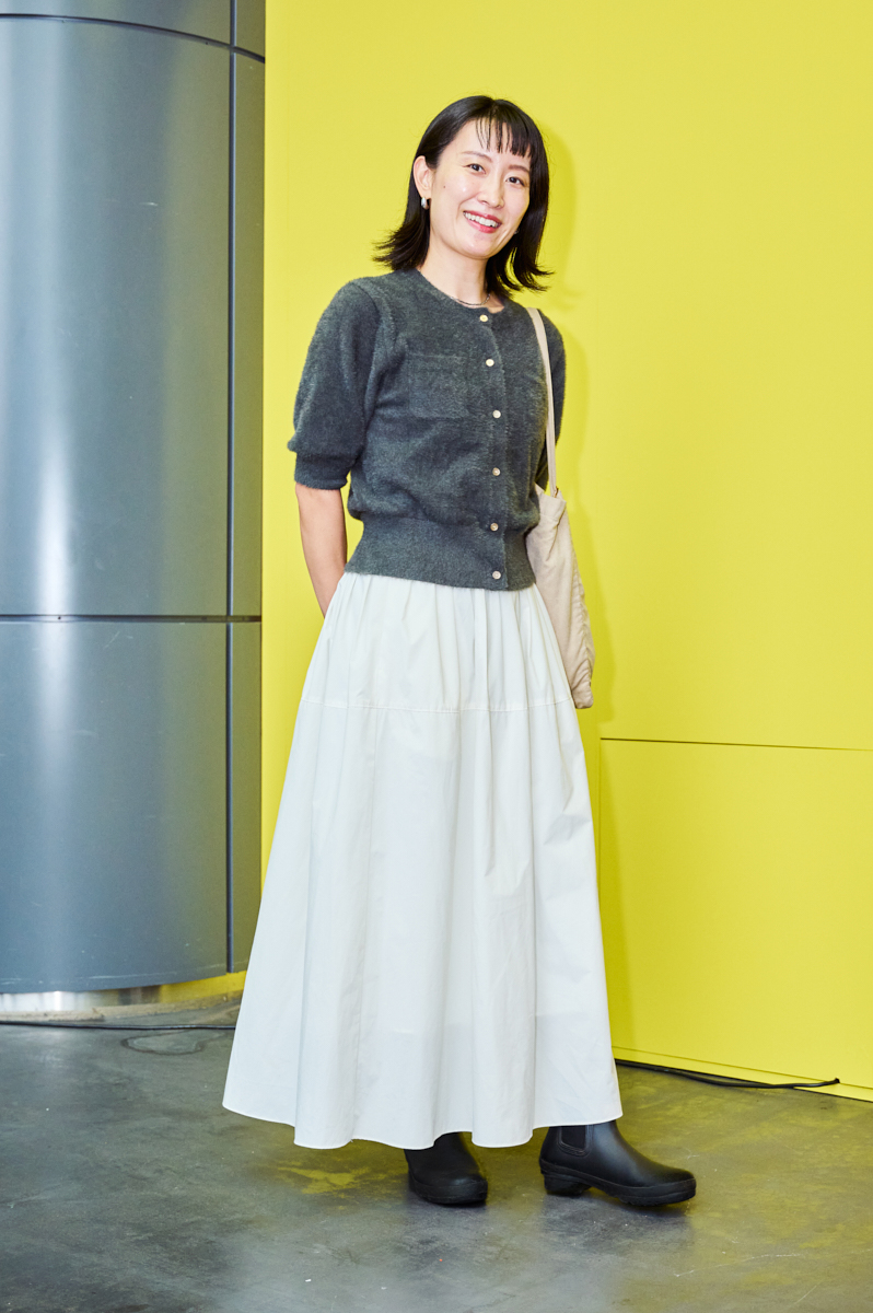 「防水性、耐久性が決め手で購入したハンターのレインブーツ。パンツスタイルよりスカートのほうが相性がいい気がします。トップスは今年買ったふわふわのフェザーカーディガンと雨にも強いステンレス素材のジュエリーを合わせた雨の日コーデにしてみました」梅沢怜子さん/会社員・33歳(5歳と3歳の男の子ママ)
