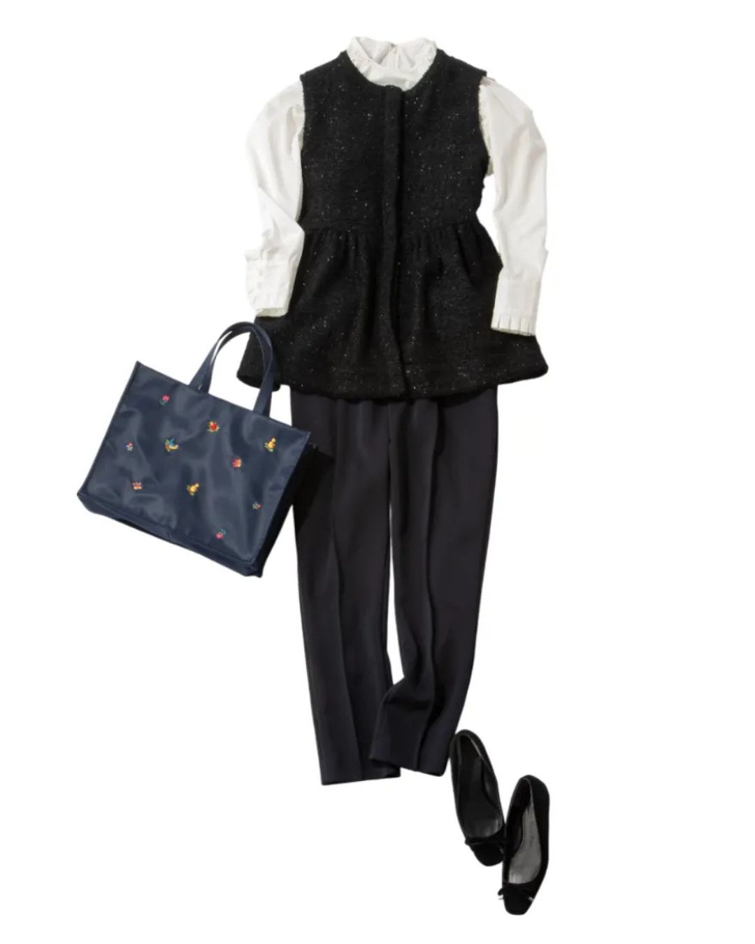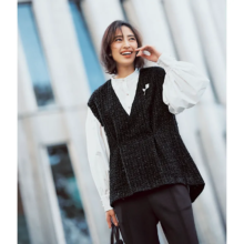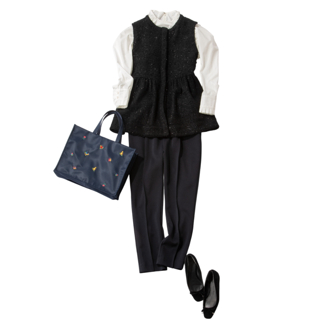 手軽にきちんと見えを叶えるジレはお宮参りにぴったりのアイテム。腕周りの窮屈さがないので抱っこもしやすく、実用性も兼ね備えているのがうれしいポイントです。きれいめな白ブラウス×フォーマルな黒パンツの王道コーデに、繊細なラメがきらめくツイード素材のペプラムジレを羽織れば、一気に華やかで上品な印象に。足元は歩きやすい黒のフラットシューズを合わせて、長時間の行事も快適に。ラメツイードジレ¥21,450(eldo)
