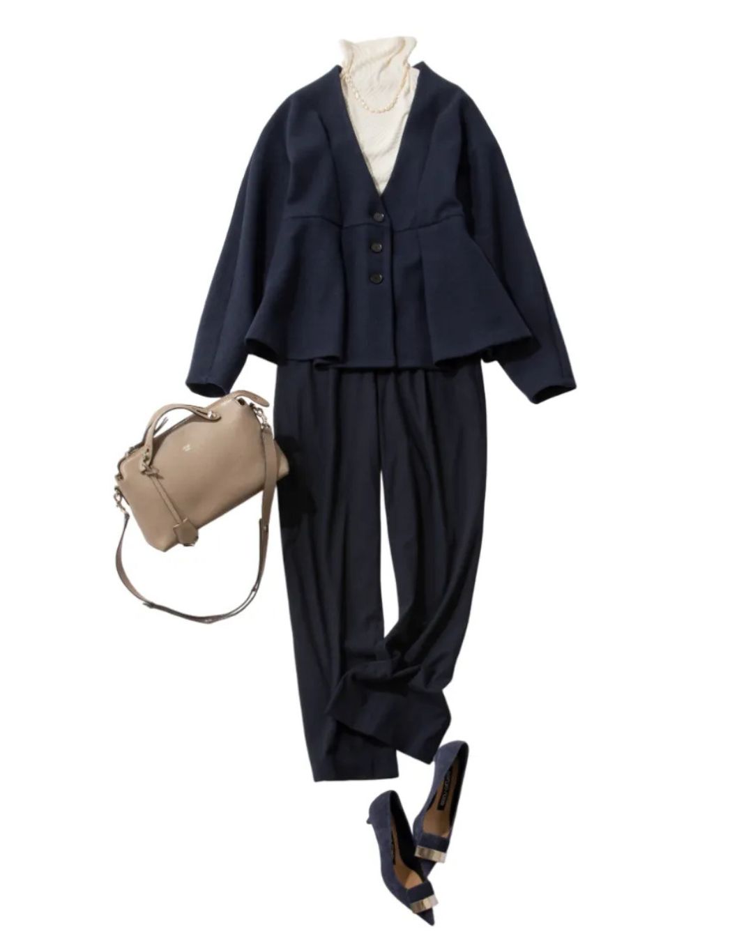 高めの位置で切り替えたペプラムジャケットは、ほどよい甘さと深めのVネックで、きちんと感も備えた優秀アイテム。ジャケットと同色のパンツを合わせると、セミフォーマルなセットアップ風コーデに仕上がります。インナーに白タートルを合わせて顔まわりを明るくすれば、写真映えもばっちりです。カーデ感覚で着られるジャケットはデニムと合わせてカジュアルに着こなすのも◎。ウールライクジャケット¥19,800(ALEGRE)