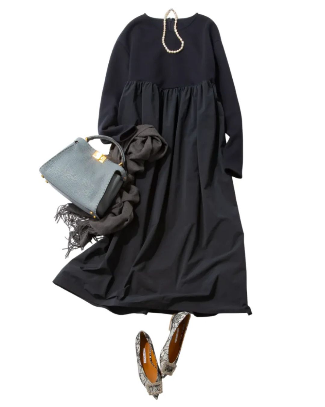 高めの位置で切り替えたワンピースは、お腹まわりを締めつけず、マタニティ期でも安心して着られる一着。落ち着いたネイビーにパールネックレスを合わせれば、七五三にもふさわしい上品な印象に。ストールは温度調整にはもちろん、コーデのアクセントとしても活躍。母としての黒子スタイルを意識しつつも、足元にビジュー付きパンプスと水色のワンハンドルバッグでほどよく華やかさをプラスすると◎。スニーカーやキャップ合わせでカジュアルにも振れる、小物次第でいろんなシーンに着回せる優秀な1枚です。ドッキングワンピース¥16,500(ALEGRE)