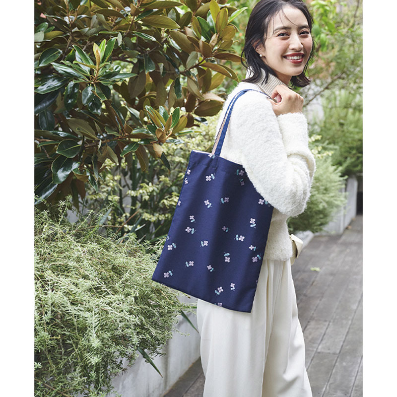 総柄プリントを裏返すと、yorタグ付きのシンプルなiキャンバス素材のネイビートートに変身!送迎や学校説明会、お仕事などのきちんとシーンに使いやすいのが嬉しい。