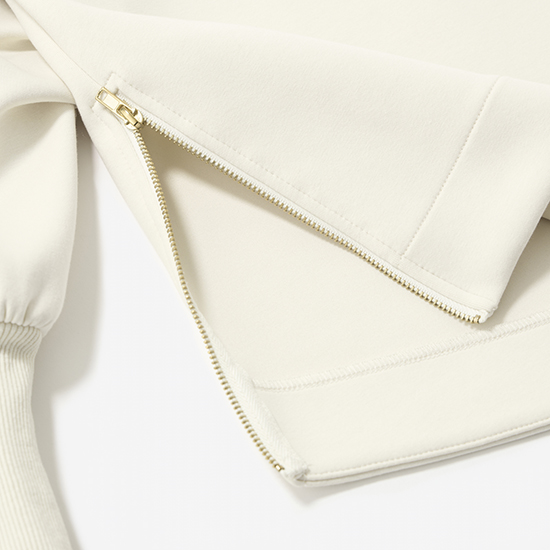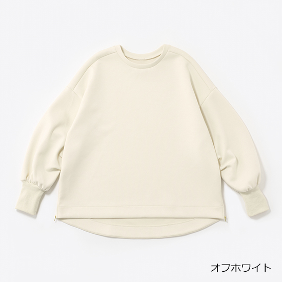 立体的なコクーン袖とスポンディッシュなハリのある素材が魅力のプルオーバー。肌馴染みの良いオフホワイトを選べば、シンプルなのに着るだけで華やかに。ふんわりとした甘めのスカートに、ヒールブーツや小さめのバッグを合わせれば、週末のお出かけにもぴったりなきれいめコーデが完成します。サイドジップを開いて、前だけ軽くインしてこなれ感のあるバランスにすると◎。