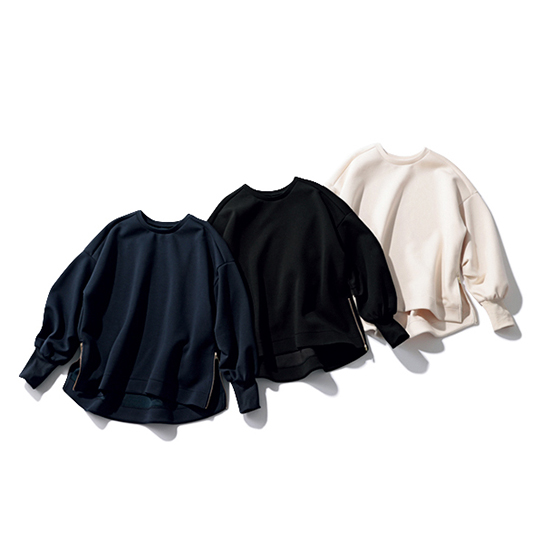ふんわりと立体的なコクーン袖が印象的な上品見えプルオーバー。スポンディッシュなハリ素材で身体のラインを拾わないうえに、ヒップまで隠れる安心丈なので体型カバーも◎。サイドジップ付きだから、ボトムに合わせて抜け感のあるバランスに調整できるのもうれしいポイントです。¥11,000