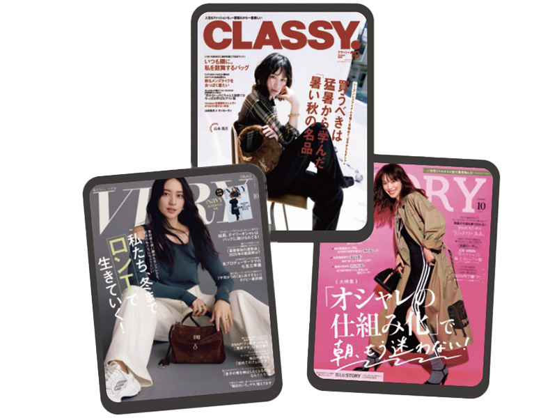 毎月デジタル版「VERY」と「CLASSY・」「STORY」の無料購読をプレゼント。ダイジェスト版でお届けしている「VERY NaVY」もフル版をデジタルで購読できちゃいます。最新号だけでなく前月号もスマホやタブレットなどの端末で読めるから、移動中やすきま時間にインプットができて便利!