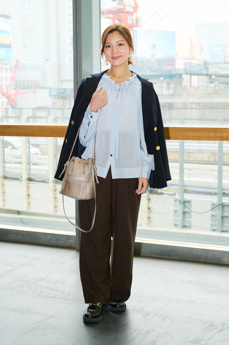 「雨に濡れても目立たないネイビーのジャケットは、小雨で肌寒い日にぴったり。薄いブルーに一目惚れした首周りのギャザーやシフォン生地がポイントのブラウスと合わせて、品良くまとめました! ジャケットを合わせることで甘ブラウスも引き締まります」松波亜弥さん・38歳