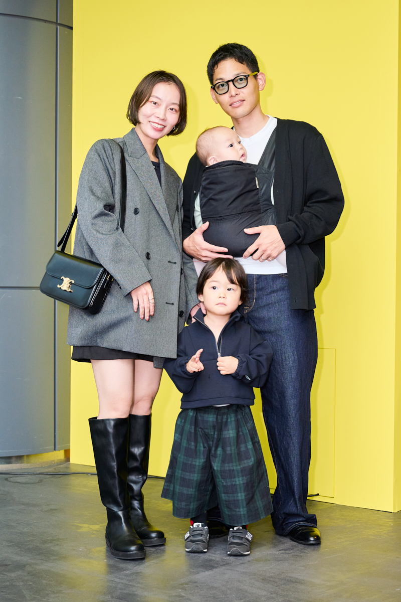 「肌寒く雨も降っていたので、温度調整がしやすいジャケットスタイルに。グレー地にグリーンとブラウンのラインが入った珍しい配色のチェックが気に入って購入しました。ゆとりのあるシルエットで、カジュアル好きの私でも気負わず着られる形なのも好きなポイント。ジャケット&スラックスのきれいめ合わせだったので、抜け感が出るようにスニーカーで外しつつベルトで引き締めました」槇彩香さん・28歳(0歳女の子のママ)