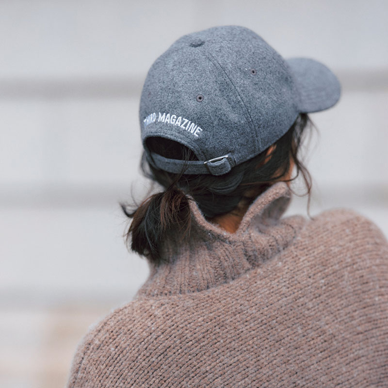 起毛素材が冬っぽい。ブラックのロゴは同色です。スエード調のブラックとウール調のグレーの2色をワンサイズ展開で販売します。シンプルながらもこなれ感のある仕上がりで、秋冬のスタイリングにぴったりです。