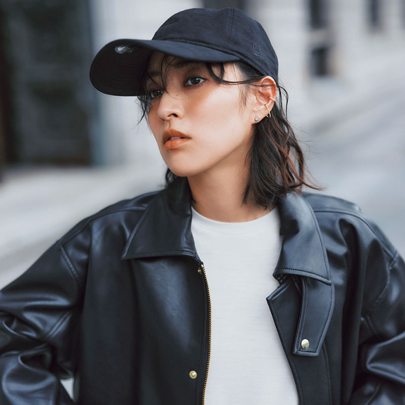 〈黒〉キャップ¥5,500(サードマガジン)カットソー¥25,300(サクラ/インターリブ)レザージャケット¥35,200(アルページュストーリー)ピアス¥110,000 パヴェバーイヤーカフ¥104,500 ミニパヴェイヤーカフ¥91,300(すべてプライマル)〈グレー〉キャップ¥5,500(サードマガジン)ニット¥71,500(ル フィル ニュウマン新宿店)