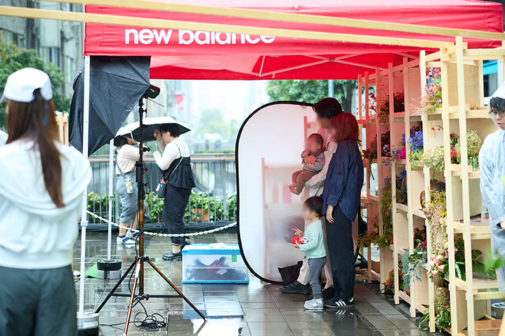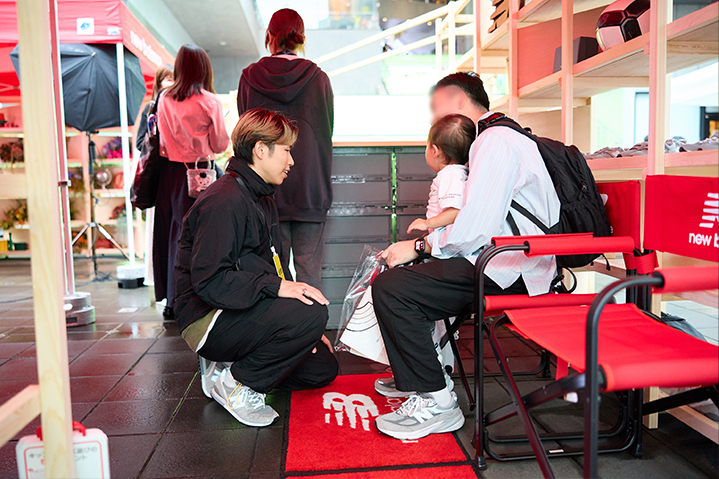 キッズシューズの販売では「きちんと計測してもらって子どもの正しい足のサイズを知れた」という嬉しい声が。キッズシューズはクッション性と屈曲性を高めているそう。稲荷橋広場に設置したニューバランスのブースはとにかく豪華で、フォトブースでは、プロのカメラマンに素敵な親子写真を撮ってもらえました。