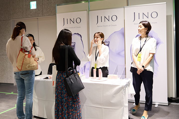 味の素社のスキンケアブランド「JINO」は新作「アミノシューティカル クリーム」を紹介。化粧水・乳液・クリームという”アミノ酸スペシャル”なセットが貰えるSNSキャンペーンも。ブースでじっくりお話を聞く来場者の表情は真剣そのもの。実際に手に取って塗布してテクスチャーを試してみるなど、たくさんの発見がありました。