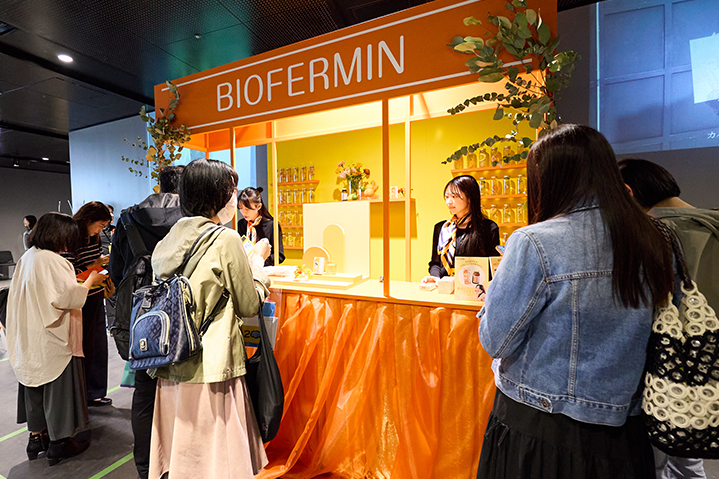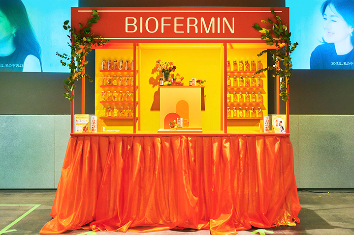 フルーツインティーのボトル展示とオレンジの世界観がヘルシーな印象を与えた「ビオフェルミン」。「新ビオフェルミンSプラス錠」の紹介が実施された。腸活*に使える嬉しいアイテムは5才のお子さまから家族で使え、現品のサンプリングもあって大人気でした。*腸を整えること