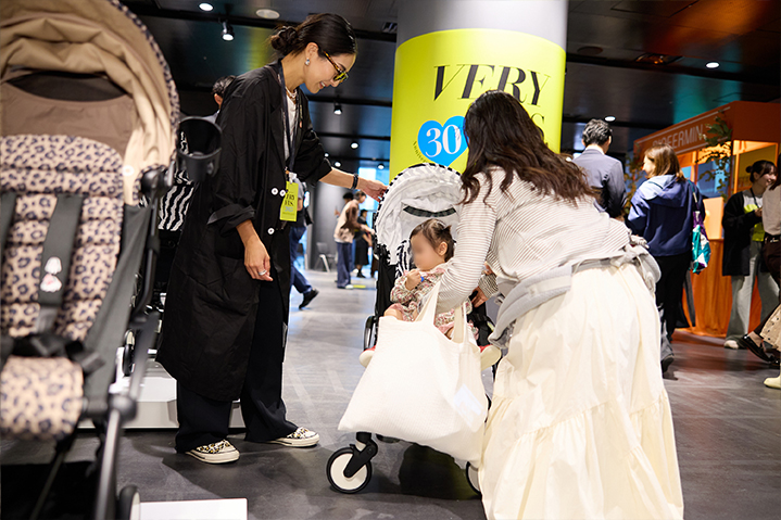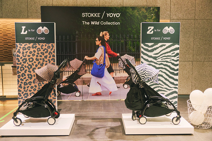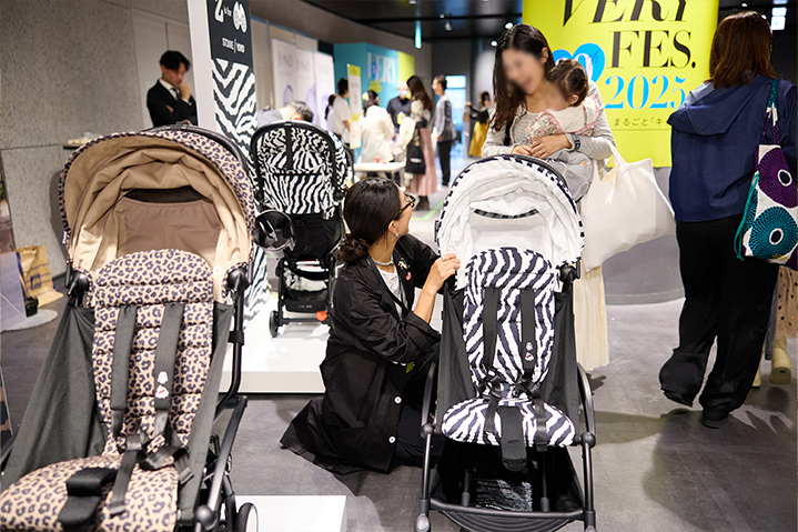 大人気ベビーカー「YOYO®」の新作Wildコレクションのメインビジュアル風に撮れるフォトスポットが。SNSフォローやハッシュタグ投稿で貰えるオリジナルノベルティ企画も。「なかなか実物に触れる機会がないので、よかった!」という声も。説明してくださった企業の方は、ベビーカーと合わせたレオパード柄のスニーカーでコーデ!