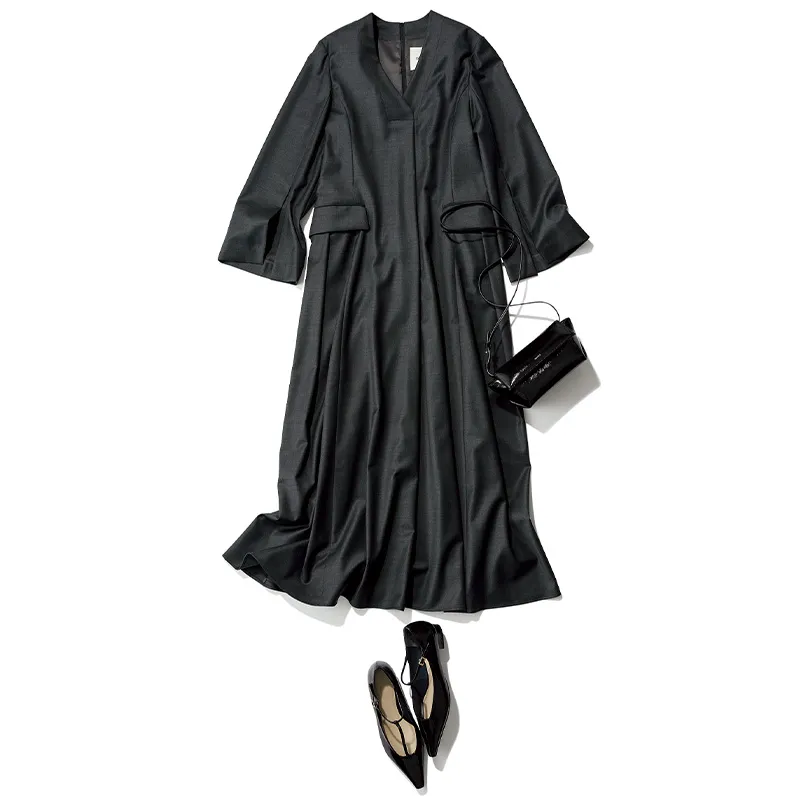 ワンピース¥82,500(デパリエ/デパリエ 伊勢丹新宿店)バッグ¥52,800(ミウール/ショールーム セッション)靴¥24,200(オデット エオディール/オデット エオディール 新宿店)