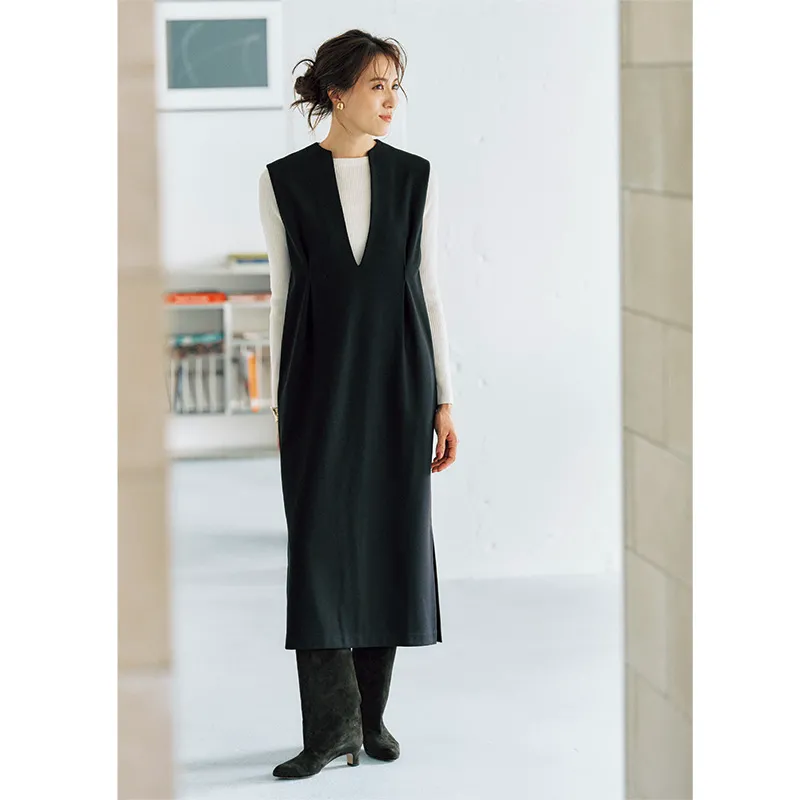 ジャンパースカート¥19,800(スリースクエア)ニット¥28,600(スローン╱ザ ショップ スローン 新静岡セノバ店)イヤリング¥11,000(アビステ)バングル¥11,550(エイチアッシュ╱フォーティーン ショールーム)ブーツ¥110,000(ネブローニ)