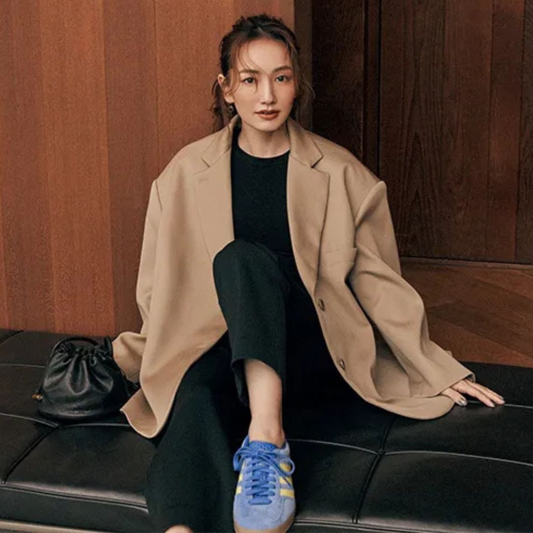 ジャケット¥60,500 Tシャツ¥11,000(ともにザハイライツ)パンツ¥31,900(ロンハーマン)ピアス¥167,200(マリハ)バッグ¥110,000(J&M デヴィッドソン/J&M デヴィッドソン カスタマーセンター)シューズ¥16,500(アディダス オリジナルス/アディダス コールセンター)