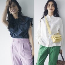 とろみのある柔らかな風合いが特徴のバックサテン素材を使用。特有のドレープ感と、膝裏まである裏地のおかげで脚のラインを拾いにくく、スタイリッシュに決まるのが魅力です。センタープレスや腰回りに施された無数のタックが、美脚効果をさらにアシスト。ウエストはしっかりとしたリブゴム仕様で、トップスINでもサマになります。洗濯機洗い可。バックサテンイージーフレアパンツ¥9,990(プラステ)