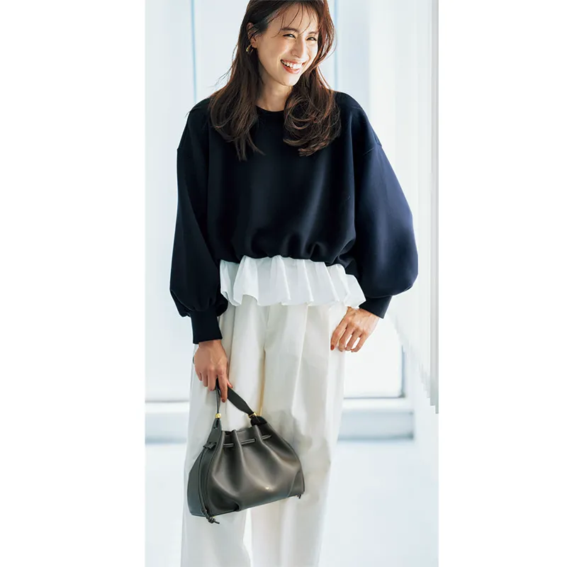 プルオーバー¥17,600(スリースクエア)パンツ¥46,200(SEA╱エスストア)イヤリング¥6,600(アビステ)バッグ¥42,900(TOV╱アンソロジー)